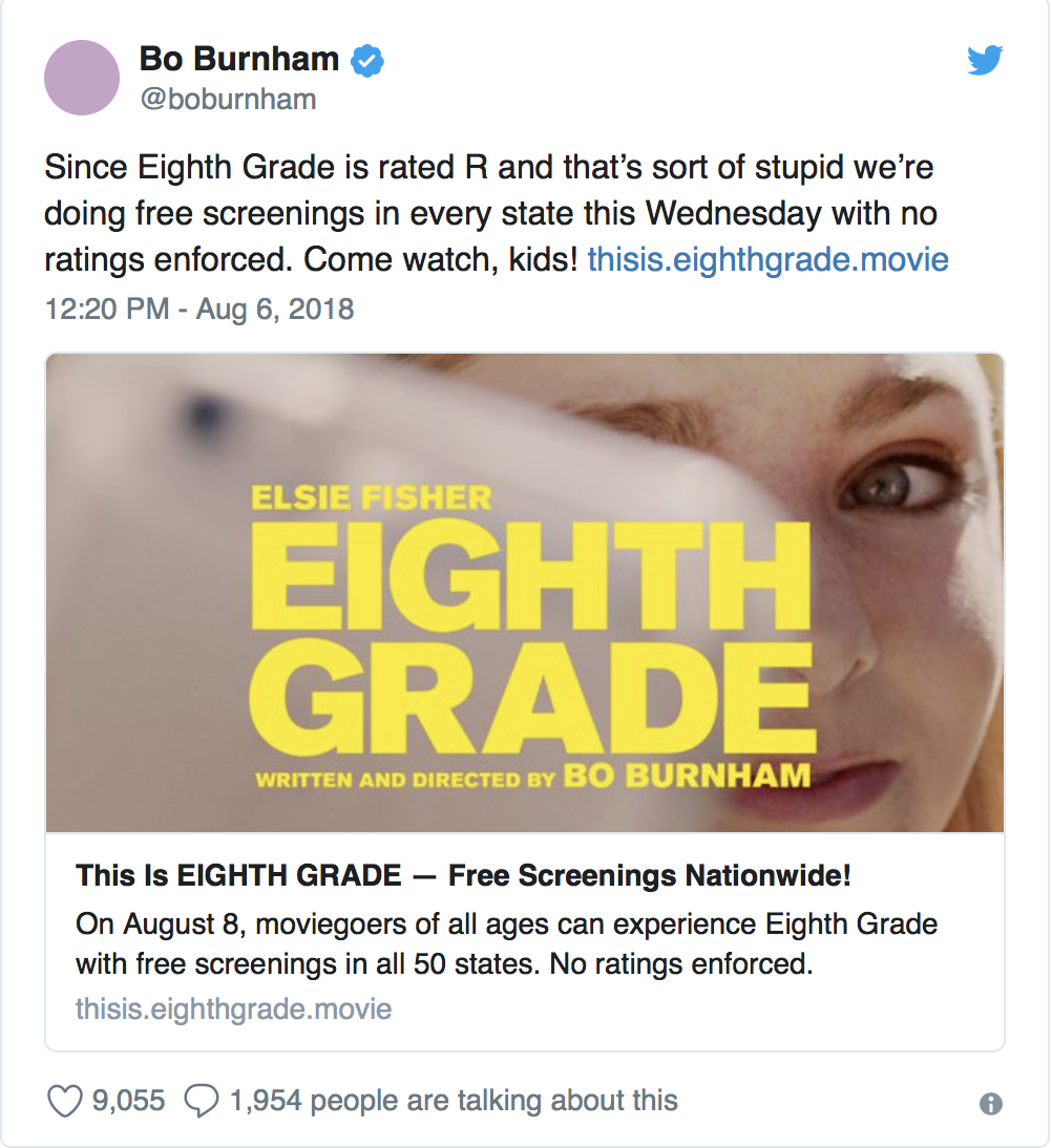 The studio A24 wants to let the right ones in to see the truly great Eighth Grade, a movie every teenager about to start high school should see. By far one of the most memorable films of the year, and one of the best about teenage girls ever made, somehow the MPAA decided to lock out the ones who need to see it most by slapping it with an R-rating. So, here is your chance to see the movie – just head on over to thisis.eighthgrade.movie.