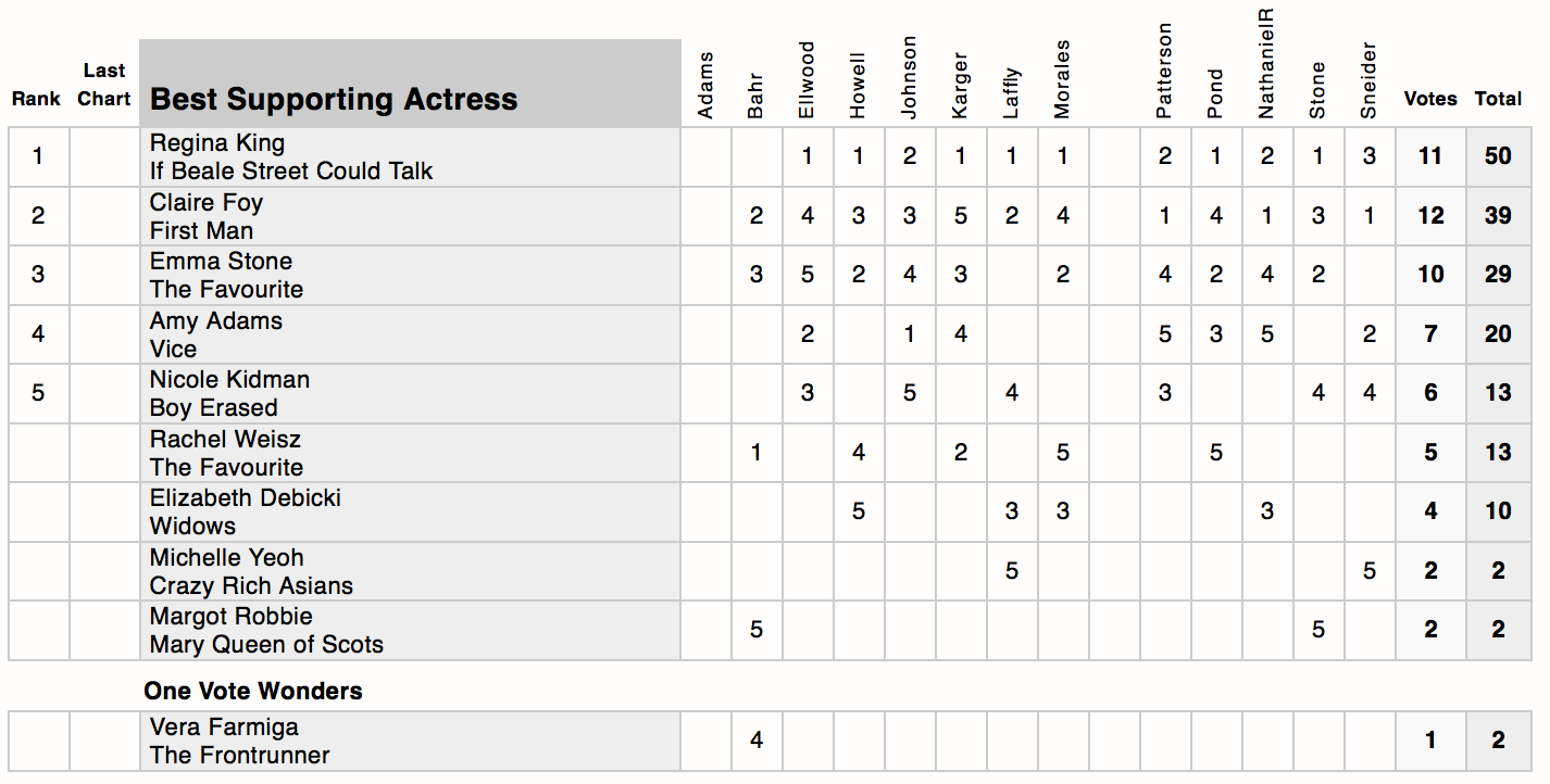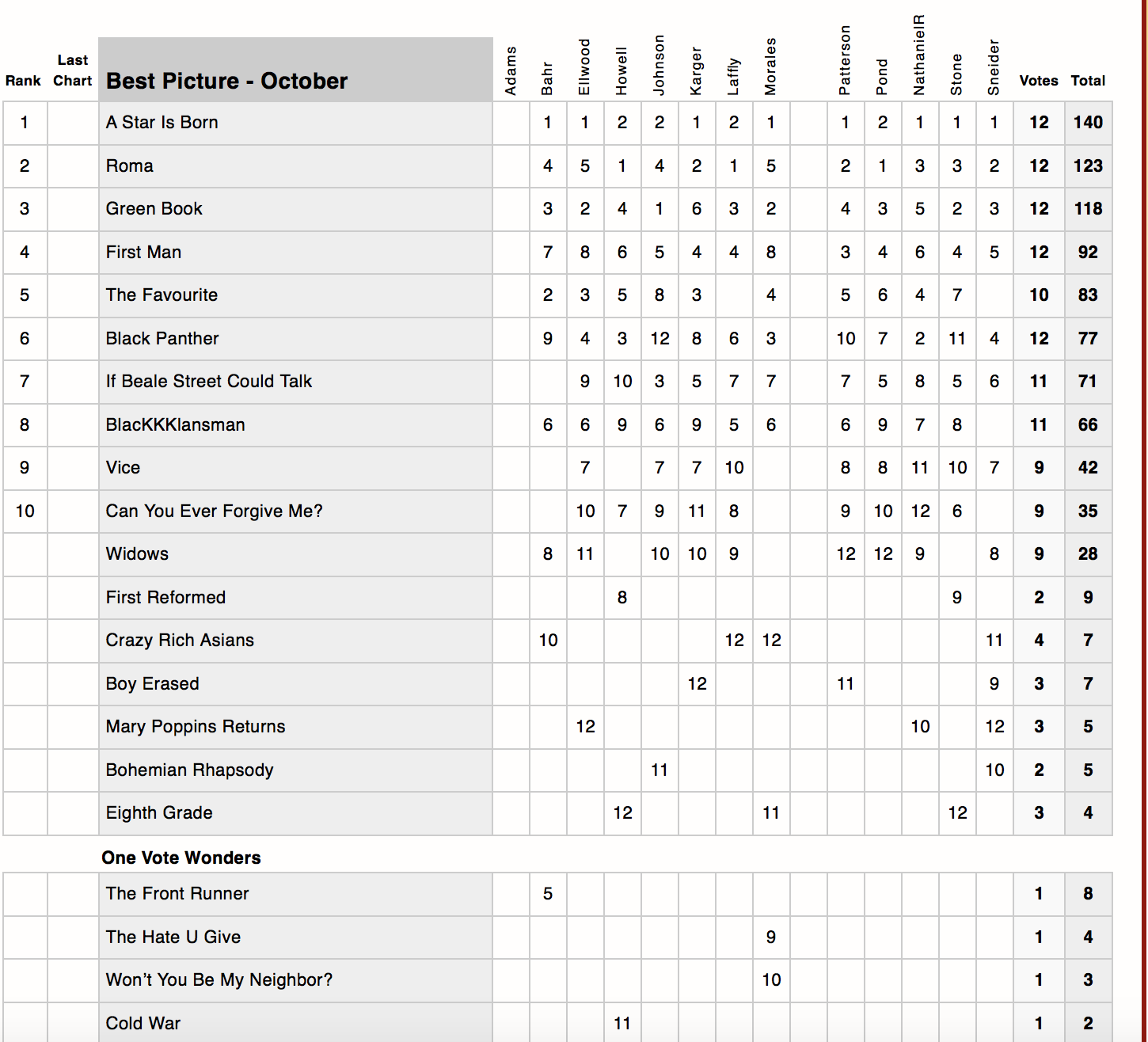 Our predictions are kind of all over the place over at Movie City News’ Gurus of Gold. I keep switching from A Star is Born to Green Book to Roma. That is why you’ll see A Star is Born here and Green Book on the previously posted charts. I don’t think anyone knows. There is a consensus – but if you look closer you’ll see there is a lot of agreement on these three categories.