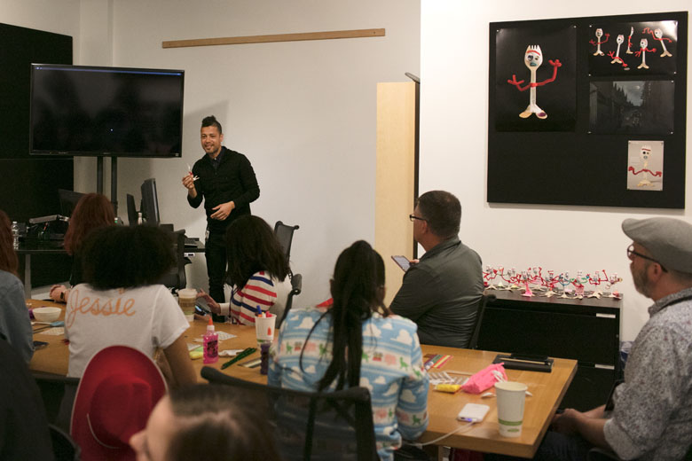 Animator Claudio De Oliveira talked about how Forky came to life. “I had to explore what Forky was about so I took it home to make some myself.” De Oliveira says, his first task was to find a spork. He jokes, “It was a little hard to find sporks. I went to a pizza joint and found some there. I’d put glue on the googly eyes and one would slide down. It was a good thing because it showed me how we could fuse life into it.” He added, “I made a few and had people took them to their desks and play with them. There were some missteps along the way, but I learned how it could come to life.”