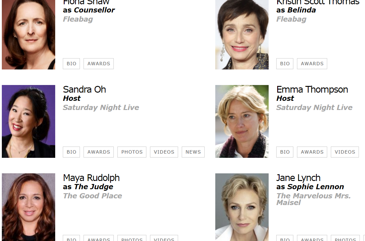 Will we have some deja vu with these year’s winners? This Is Us has two nominees in the Guest Actor in a Drama Series categories (Michael Angarano and Ron Cephas Jones, respectively), so will we have another winner in the same vein? Will Saturday Night Live continue its dominance of the Comedy categories? Or will Sandra Oh become a double winner and take Guest Actress in a Comedy and Leading Actress in a Drama Series for Killing Eve?