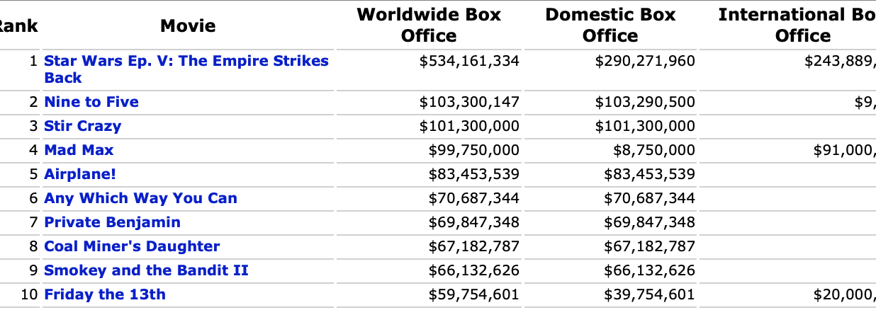 At that point, nobody but George Lucas and Steven Spielberg seemed to know the secret of making blockbuster lightning strike repeatedly. But let’s give a little credit to audiences too, who were learning how adapt to must-see movie events. Airplane!, Mad Max, fuck, even Nine to Five at number 2. These were movies everyone wanted to see because nobody wanted to be left out of the cultural conversation. Word of mouth had always been the kind of advertising that money couldn’t buy, and especially so when combined with be there or be square.