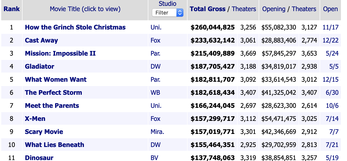 The following year, yes, welcome to new reality. We now see what box office would come to be. 8 of the top 10 movies are either sequels or movies that would spawn sequels. Harry Potter and Lord of the Rings were both original stories made from original books. And it might have have ended at that. if neither had made much money. Hahaha, as if. They made a lot of money. A LOT, A LOT, A LOT of money.