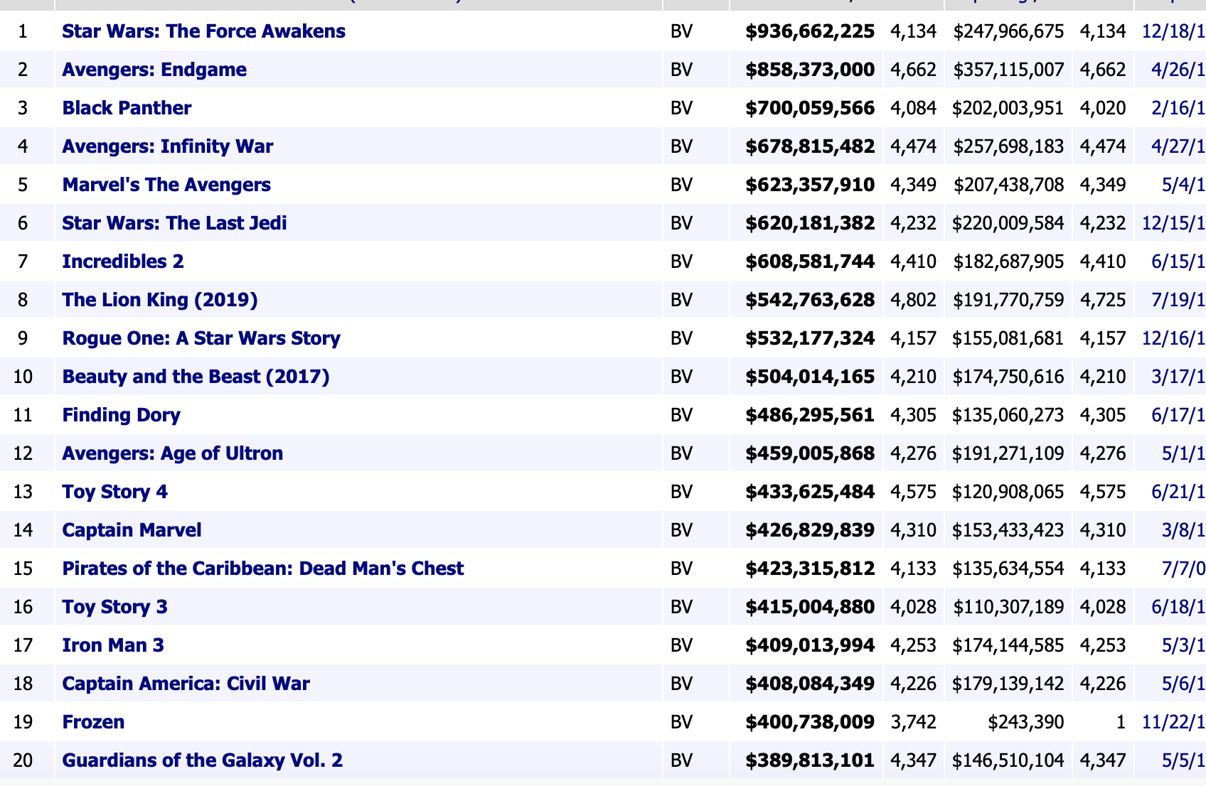 Something really dramatic happened between 2000 and 2001 to shift the top box office earners away from adult fare to 100% kid and teenage fare. Just look at the profits. Because you can be sure that’s what the shareholders and studio execs were looking at. When it’s crystal clear that so much money can be made with sequels and franchises and brands, the easiest decision in every corner office is to greenlight more of the same. And what better way to spin off variations on a theme than to latch onto proven treasure troves. Marvel and Star Wars have all but owned the franchise market and they’re now owned by the same company. Disney. Disney cracked the code. Finally — full saturation deep into the brilliant and guaranteed consumer model of fewer choices, expectations met:
