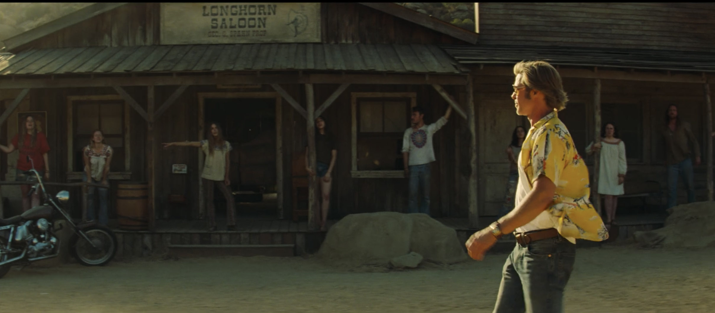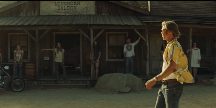 Which is the image that lingers most? Is it Brad Pitt gliding across the dusty landscape of Spahn Ranch in a yellow Hawaiian shirt before he beats the barefoot, mangle-toothed Clem back into the dust, with two words, “Fix it!”? Is it Cliff Booth’s dog Brandy launching at Tex Watson? Is it the teary-eyed Rick Dalton being consoled by Julia Butters as a sharp young actress (“Poor Easy Breezy”). Is it the brilliant Leonardo Dicaprio coming undone in his trailer after being unable to remember his lines, or is it his “evil sexy Hamlet?” Is it Brad Pitt once again bringing a whole new generation to its knees with the simple act of peeling his shirt off — AGAIN — as he did at the beginning of his career in “Thelma and Louise?” Is it hollow-eyed Dakota Fanning watching TV in a shack while Bruce Dern as George Spahn sleeps in the back room?