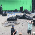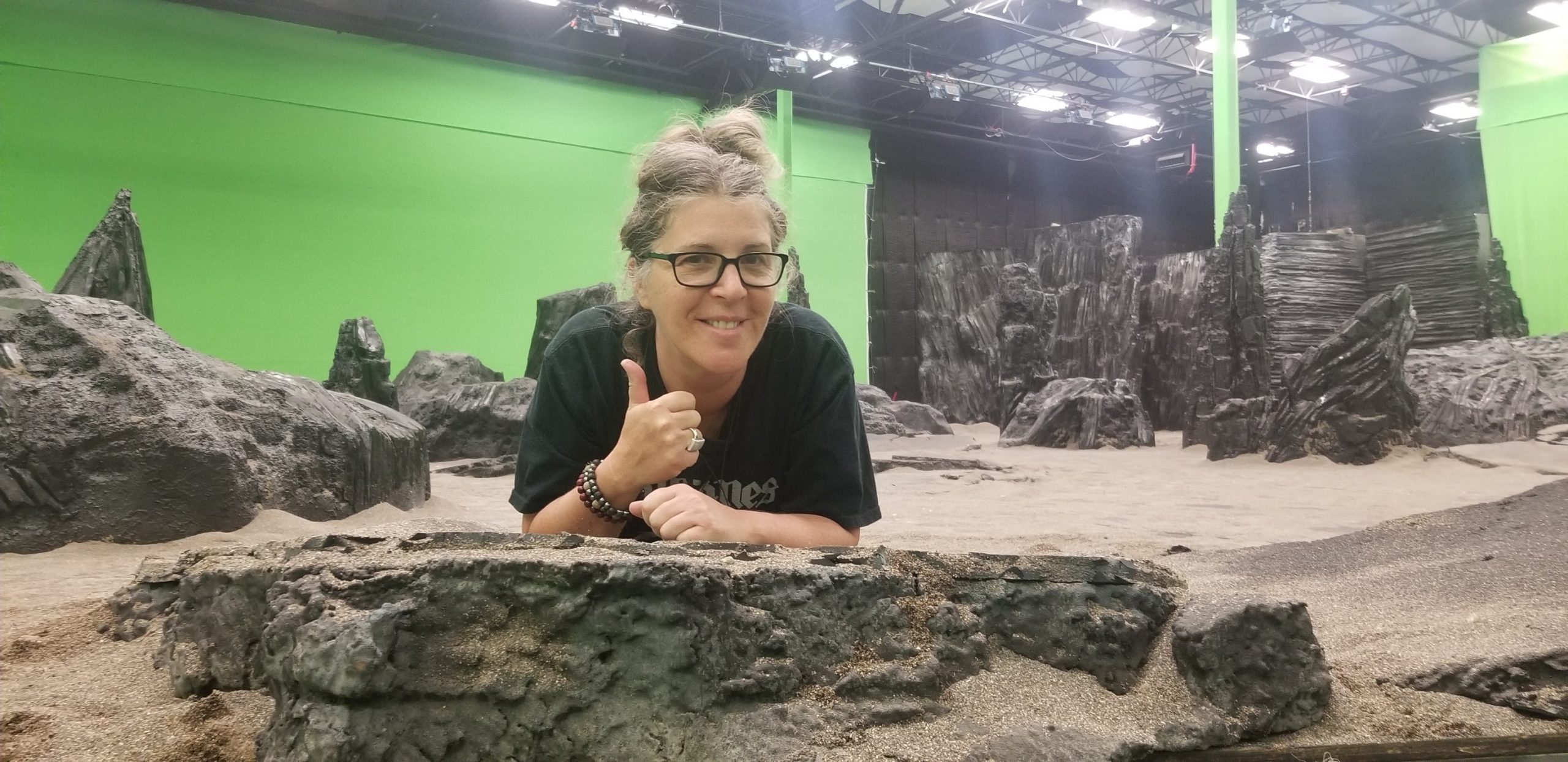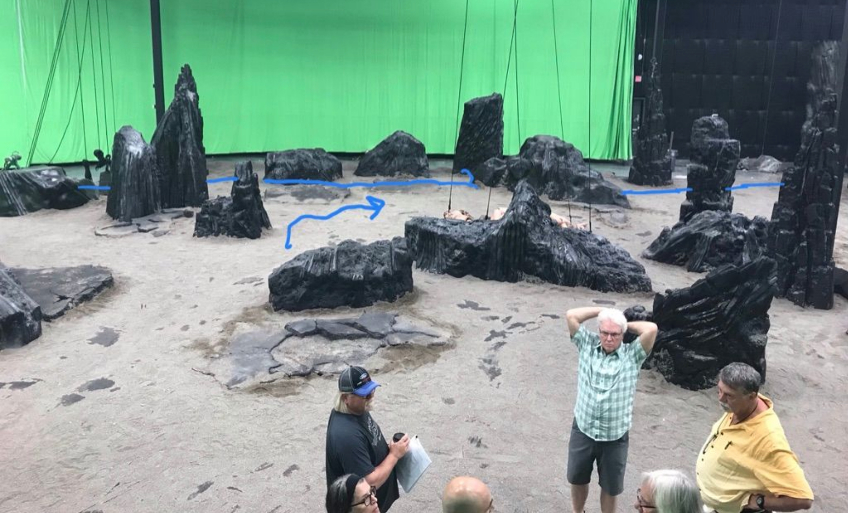 First up, Bill and Ted revisit their ex-bandmate the Grim Reaper / Death (William Sadler) in hell. Many of the backgrounds were provided using CGI, but Jones needed to design a functioning set resembling a comic vision of hell. To render the hell geology, Jones and team created broken, cracked earth with an abundance of sand and dirt. Peppered amongst the set were what Jones calls “hell rocks,” which she considered the most fun to create in the film. She had to determine hell’s color and texture and then apply that to a series of rocks to form hallways or caverns.