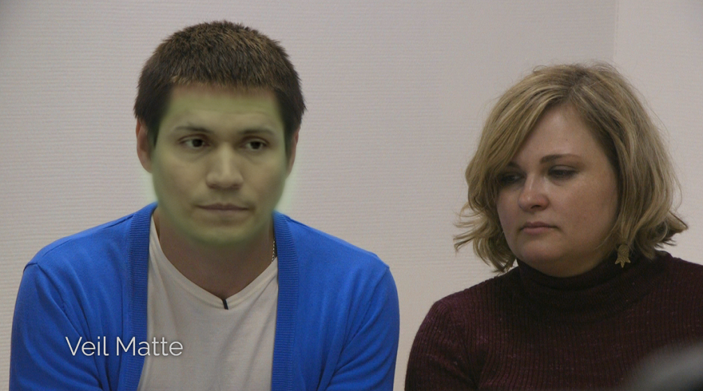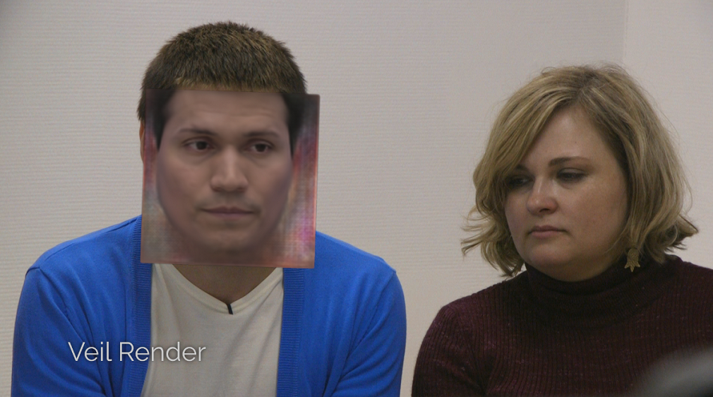 RL: We call it veiling. Face replacement is used a lot in visual effects for stunts and it has a different purpose. With a veil you reveal things and hide others. All of the expressions and the emotions that come through on these veils is from the original person’s and it’s just the eyebrow shapes and the lip shapes and the nose shape that is different. It’s more like applying a prosthetic if you think of it as a moviemaking standpoint. The person David filmed on location is all of them, except the things that would reveal their identity.