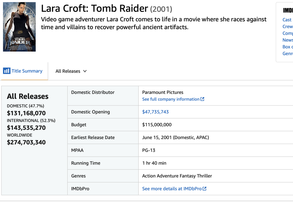 Both Tomb Raider movies made about the same about the same amount of money internationally, which is interesting and telling. But the Angie version made much more in America. So what’s that about? America is a decisively different country than anywhere else in the world. For example, for better or worse, nowhere else that has a thriving movie industry — China, India, South Korea – is as obsessed with superhero movies as the United States.