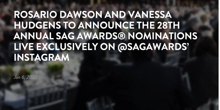 Tomorrow morning at 7 a.m., the nominations for the SAG awards will be announced live on Instagram. We will do our best to collect those nominations and get them to you as quickly as possible. You can always sign up to our mailing list and have them emailed directly to you when they arrive.