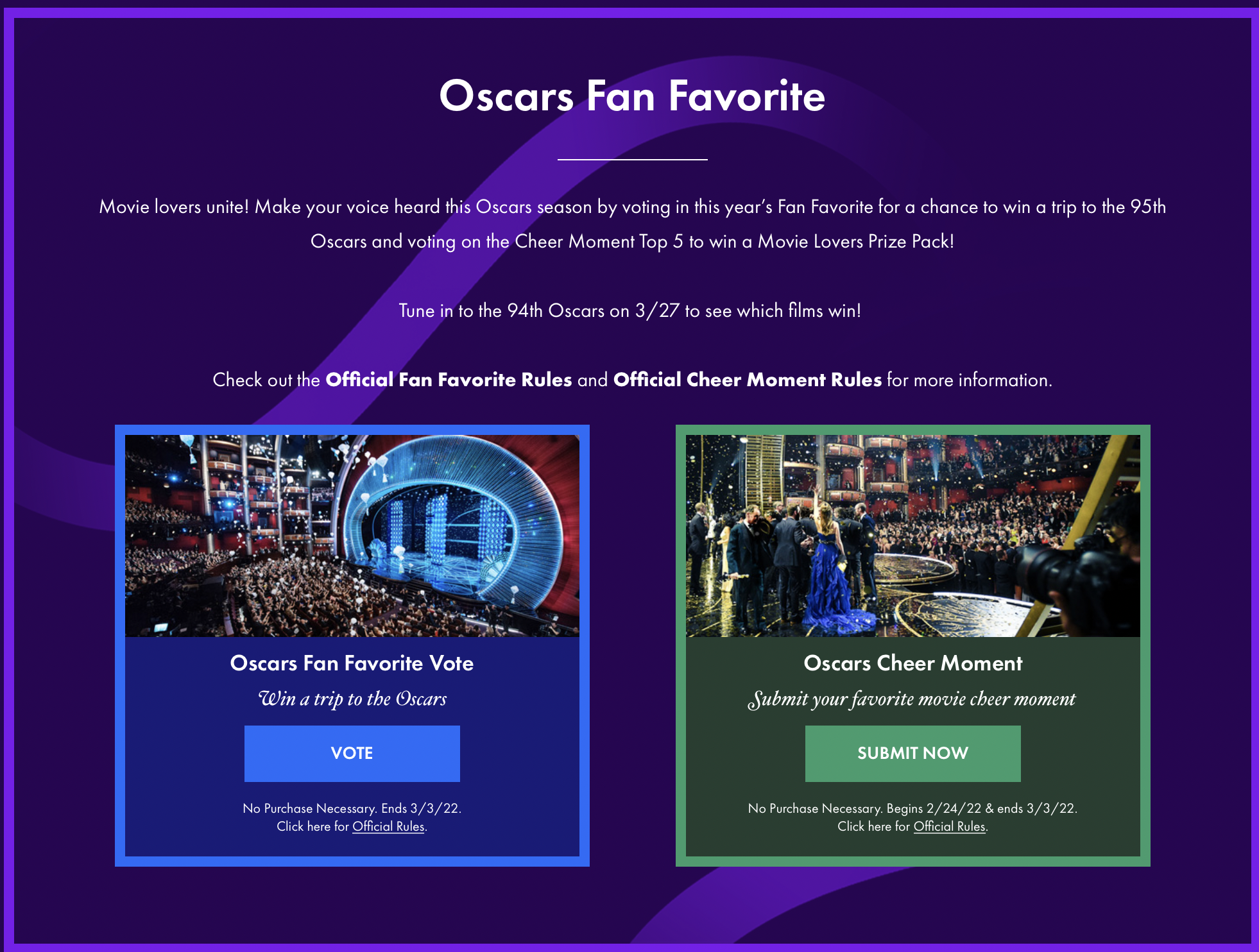 Entrants are US and territories only. For more info, head to OscarsFanFavorite.com.