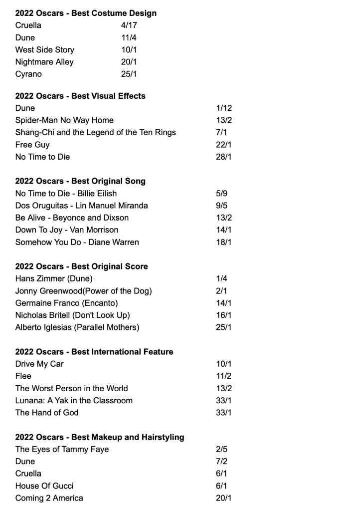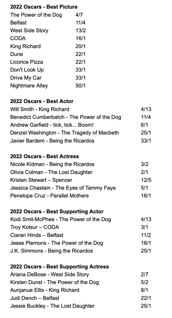 I bring this up because the oddsmakers now are mirroring the consensus based on the bubble. Now, it’s possible that this is exactly how the Oscars will roll out, that voting across the board will mirror what the pundits believe. I am not so sure, and I personally think Belfast is being greatly underestimated because it reflects bubble thinking, not what a larger consensus, or broader majority might think.