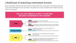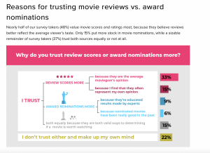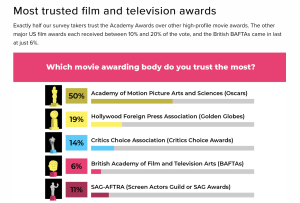 The good news is the people polled still trust the Academy Awards, even if they don’t use the nominations to choose what films to watch. What that tells me is what my daughter and her friends have already told me – they don’t think the Oscars care about awarding “best” anymore, that they are serving some kind of social justice cause. But those polled somehow still see the Oscars as legit.