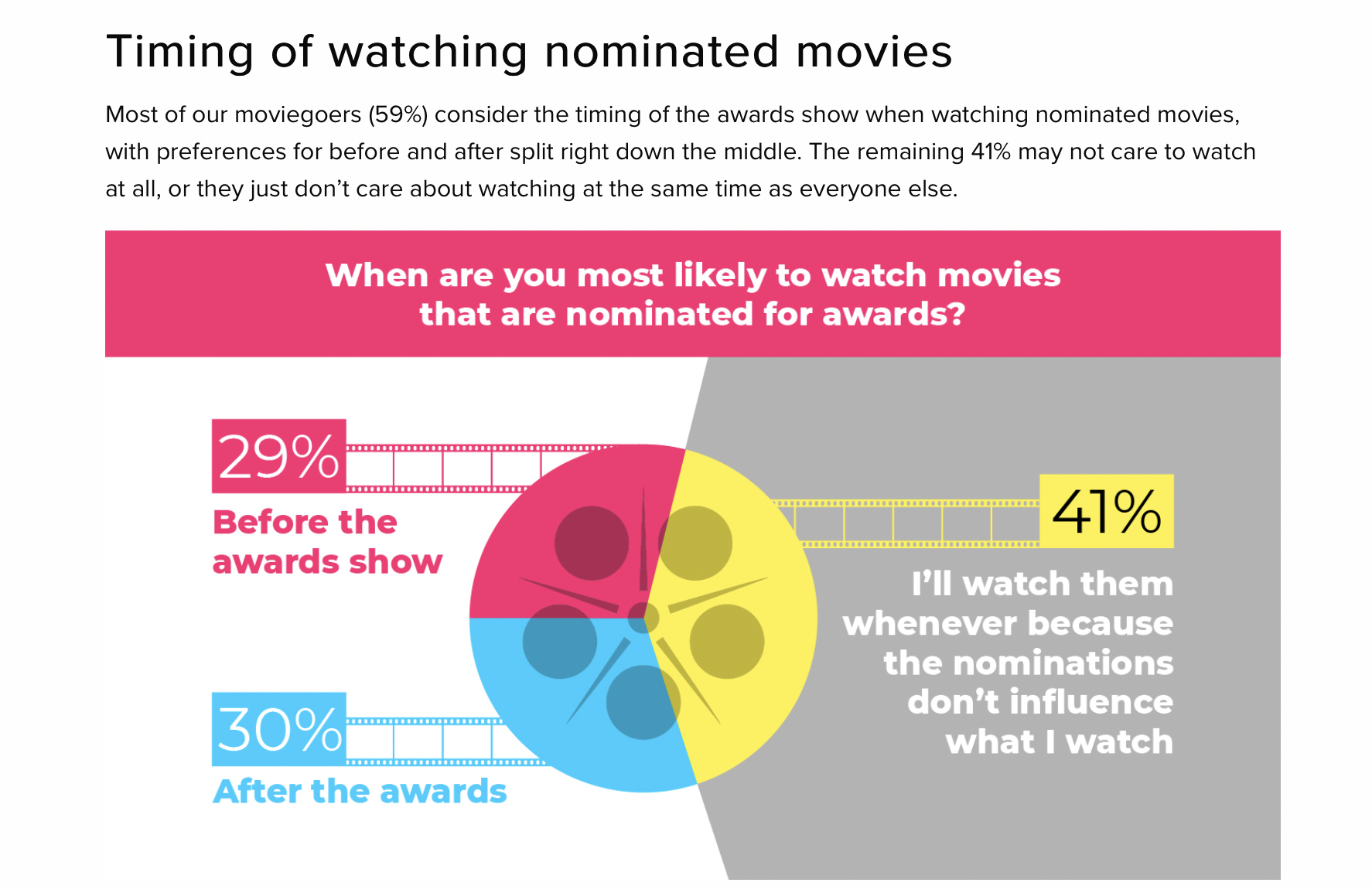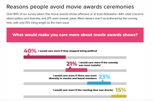 We didn’t need a poll to tell us what we already know. Anyone who covers this beat knows that the awards shows of late have become, well, about watching the most privileged people in the world signal their virtue and their suffering. Or, as Richard Rushfield puts it in his “state of the industry” piece, an exceptional piece of writing you won’t see anywhere else (because most who cover this industry are clutching their hearts and balls in fear):