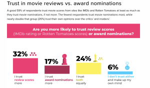They also seem to be inclined to look at Rotten Tomatoes’ scores – whether by critics or audiences – when it comes to choosing what movie to watch. We all do that, right? Don’t you look at review scores when buying something? You want to know just how bad it is. The problem is that, at least in my opinion, if you are going to go by ratings, the audience is probably more reliable. The critics are often the polar opposite of what audiences think.