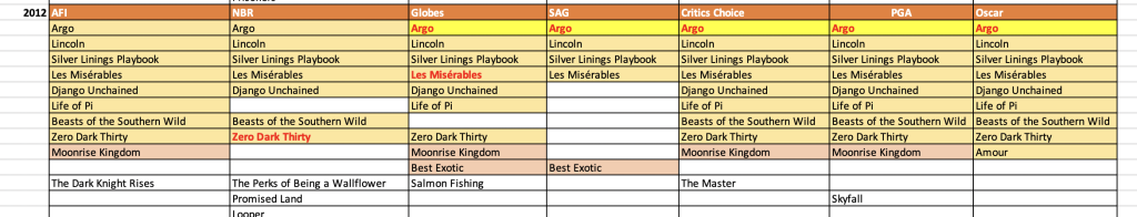 What these two years have in common is that they were driven by a frontrunner that would end up winning in the major categories. Argo obviously had a cleaner shot, but The Hurt Locker was solid after the Golden Globes.
