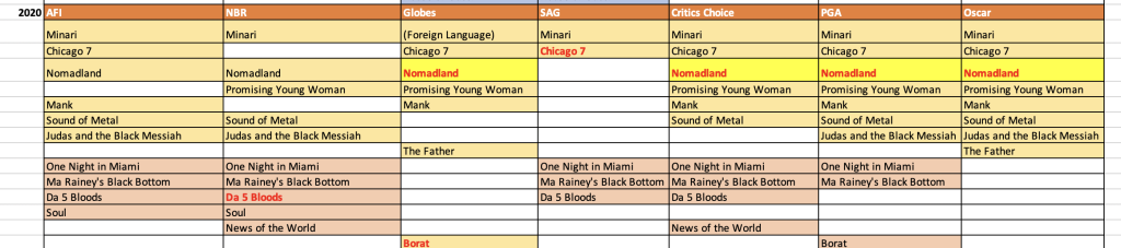 Every other year there have been films that were named on both lists but didn’t go all the way, like 2018 and 2020: