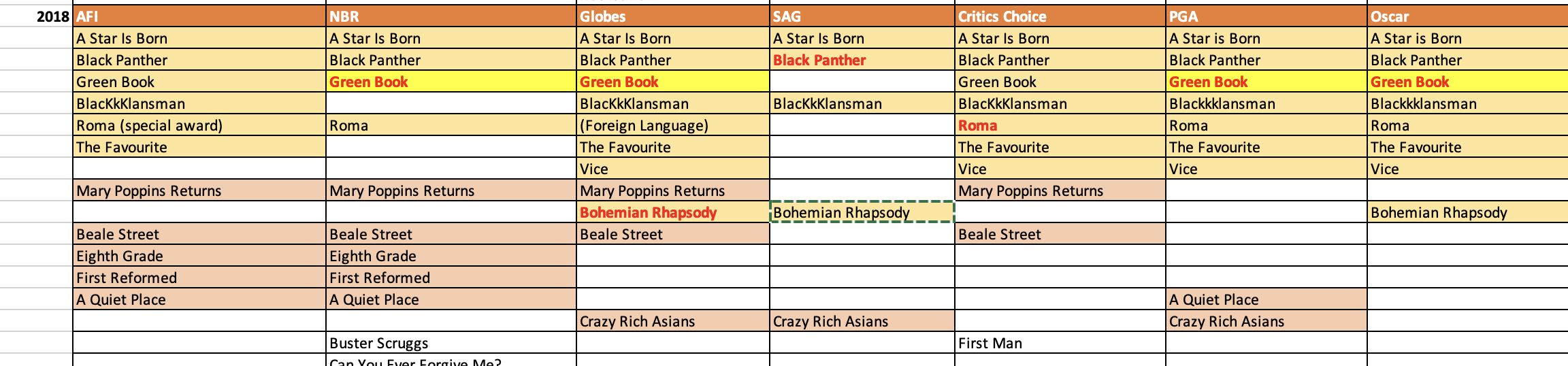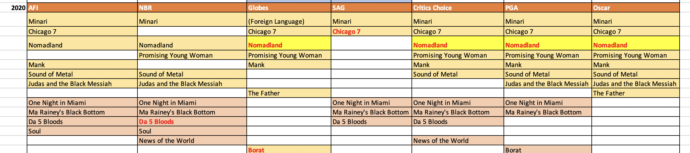 It’s a fairly minimal list. Most Best Picture nominees were named on least one, many on both. Those that showed up later likely did so driven by the actors in most cases. Put that together with how rare it is for all of those that showed up on both lists to get in, and you can see that there could be some surprises in store, even for films that seem like sure bets.