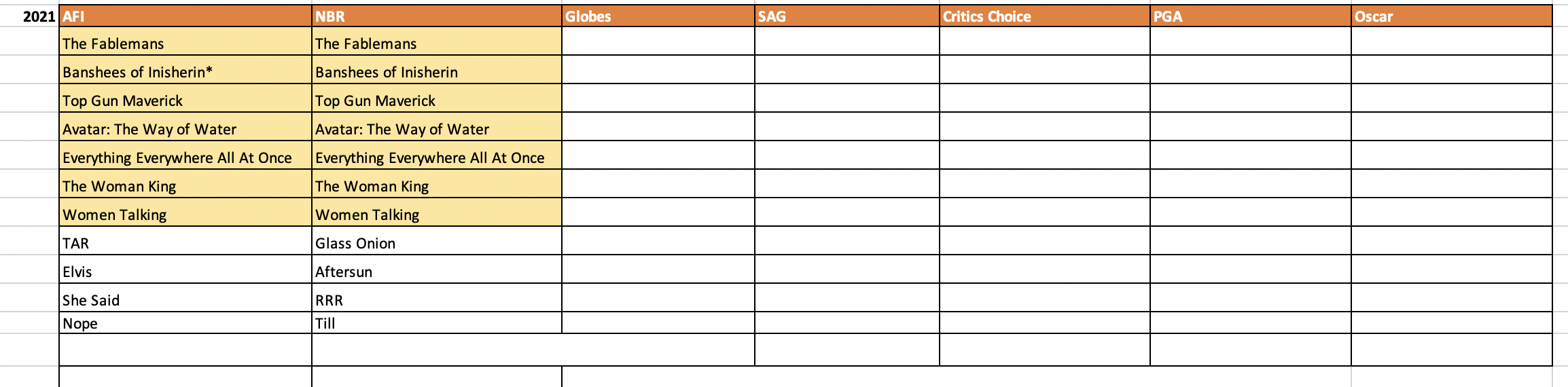 So I would bet that these films all have the best shot at Best Picture. But at the moment, both Top Gun and Avatar also seem like strong contenders. At the moment, we have to keep our predictions holding the line with this being a year where all of the films on both lists get in by the end.
