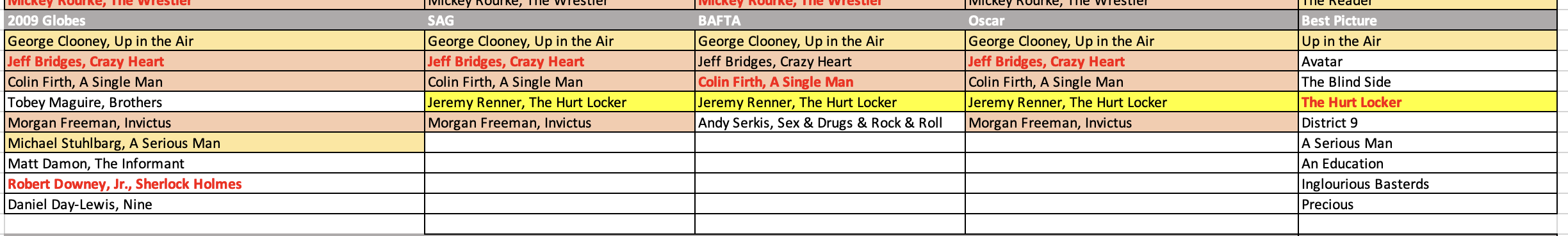 2002 had a split vote scenario happening, with Jack Nicholson winning the Globe for About Schmidt and Daniel Day-Lewis winning the SAG for Gangs of New York, while Adrien Brody was the beneficiary at the Oscars.