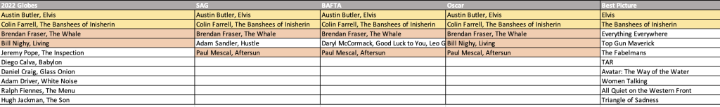 They clearly loved both the Banshees of Inisherin and Elvis. The BAFTAs come first, just before the end of SAG voting, which puts them in the sweet spot. I would imagine that Colin Farrell is going to win there, but it’s possible Austin Butler does and if so, then the Oscar is his.
