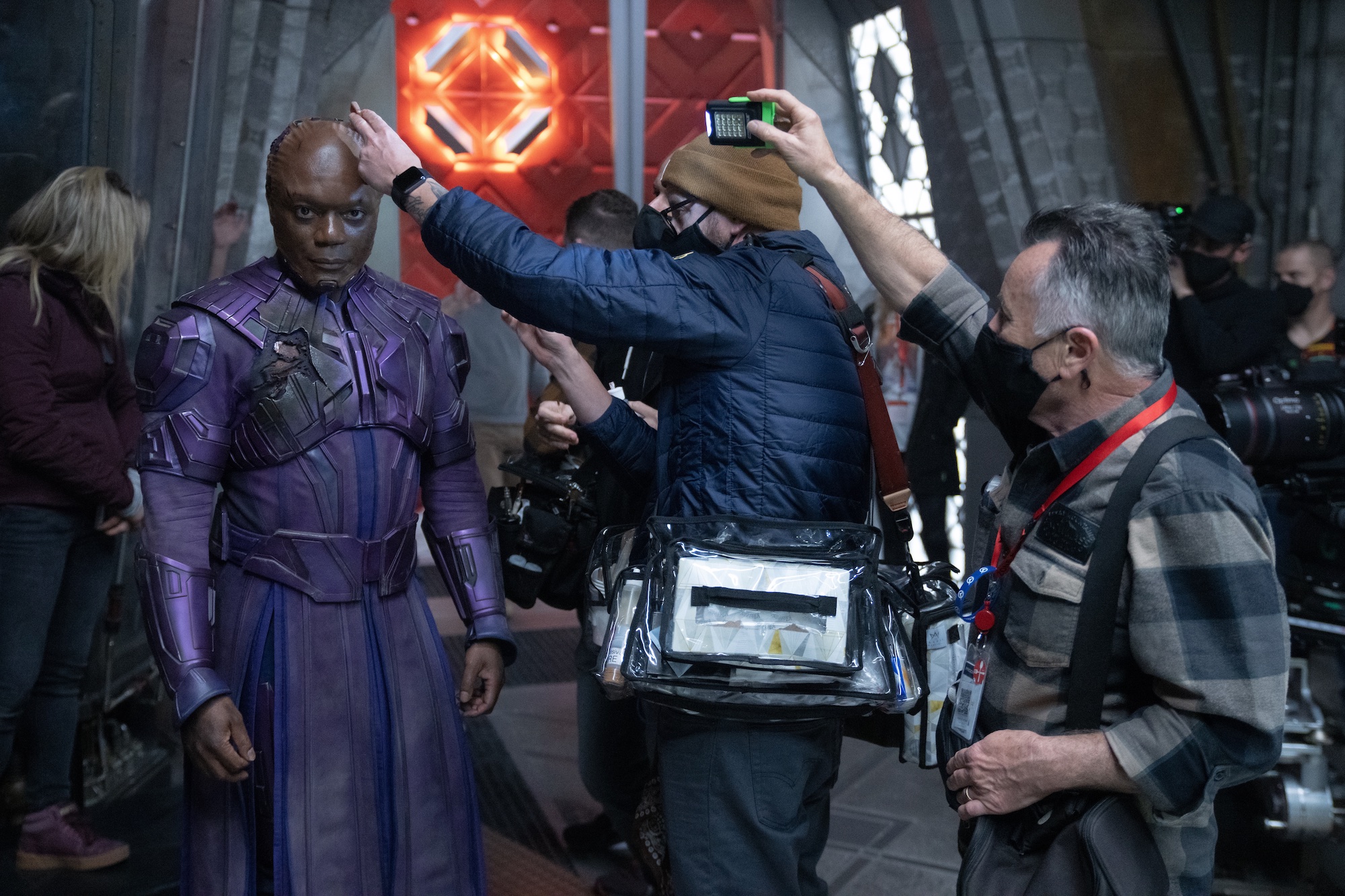 Cassie Russek: The Recorder Guards and Scientists, including our incredible High Evolutionary, Vim and Theel. When designing those looks, we came up with an idea: instead of having everyone just be bald, let’s do a very clean bald fade so that every actor still had hair to style and it cleared those super cool prosthetics. For High Evo, we wanted a haircut that stood out from other villains, as well as for Chuk to have hair that he could live with for 9 months! Once we settled on the look, we had barber Tommy “TJ” Dudley work with Chuk – he nailed the haircut so perfectly that it became the look and design for each recorder. We had so many incredible barbers on this film! Nico Santos and Miriam Shor (Theel and Vim) committed to the haircut as well, we thanked them everyday!