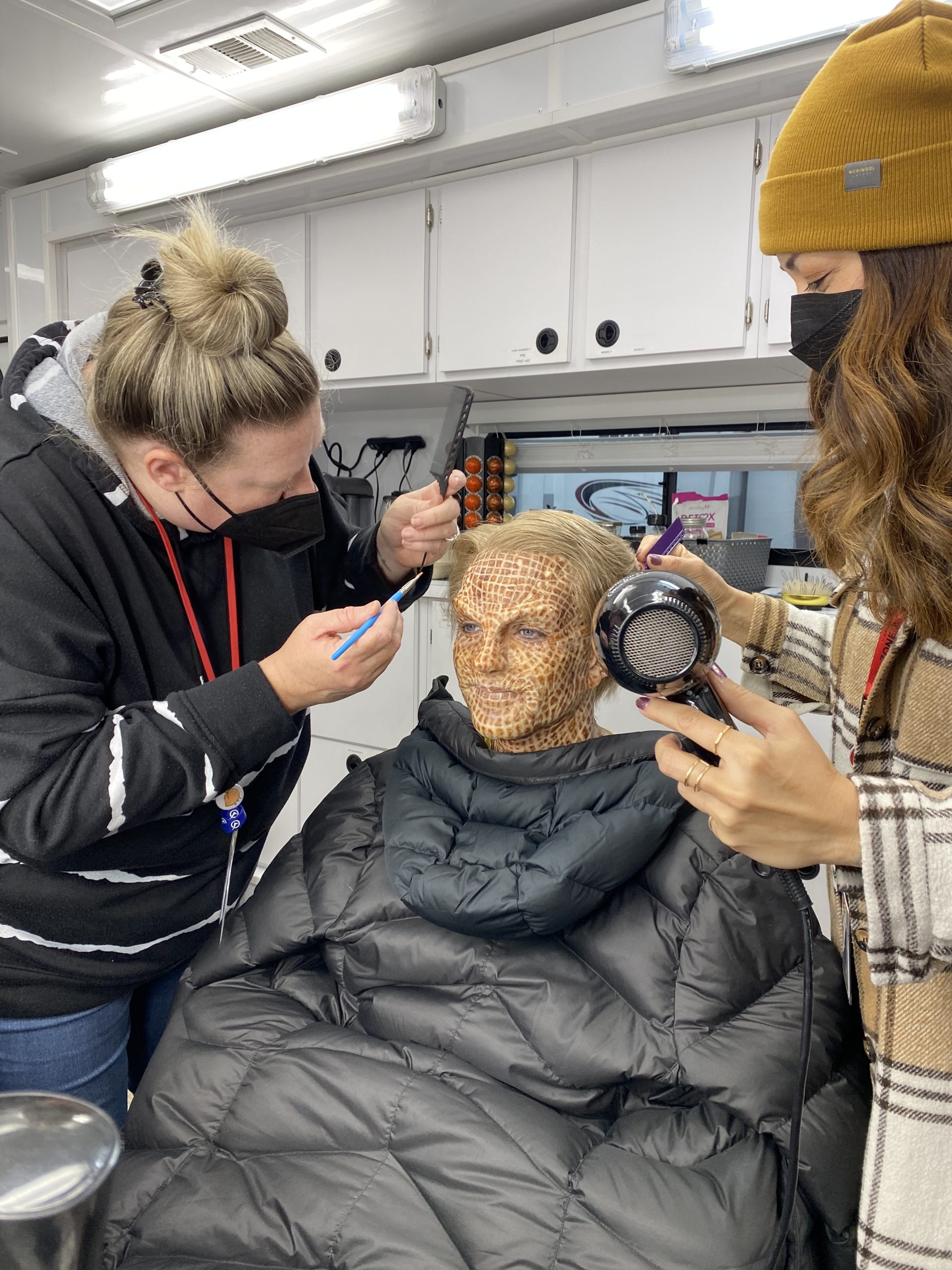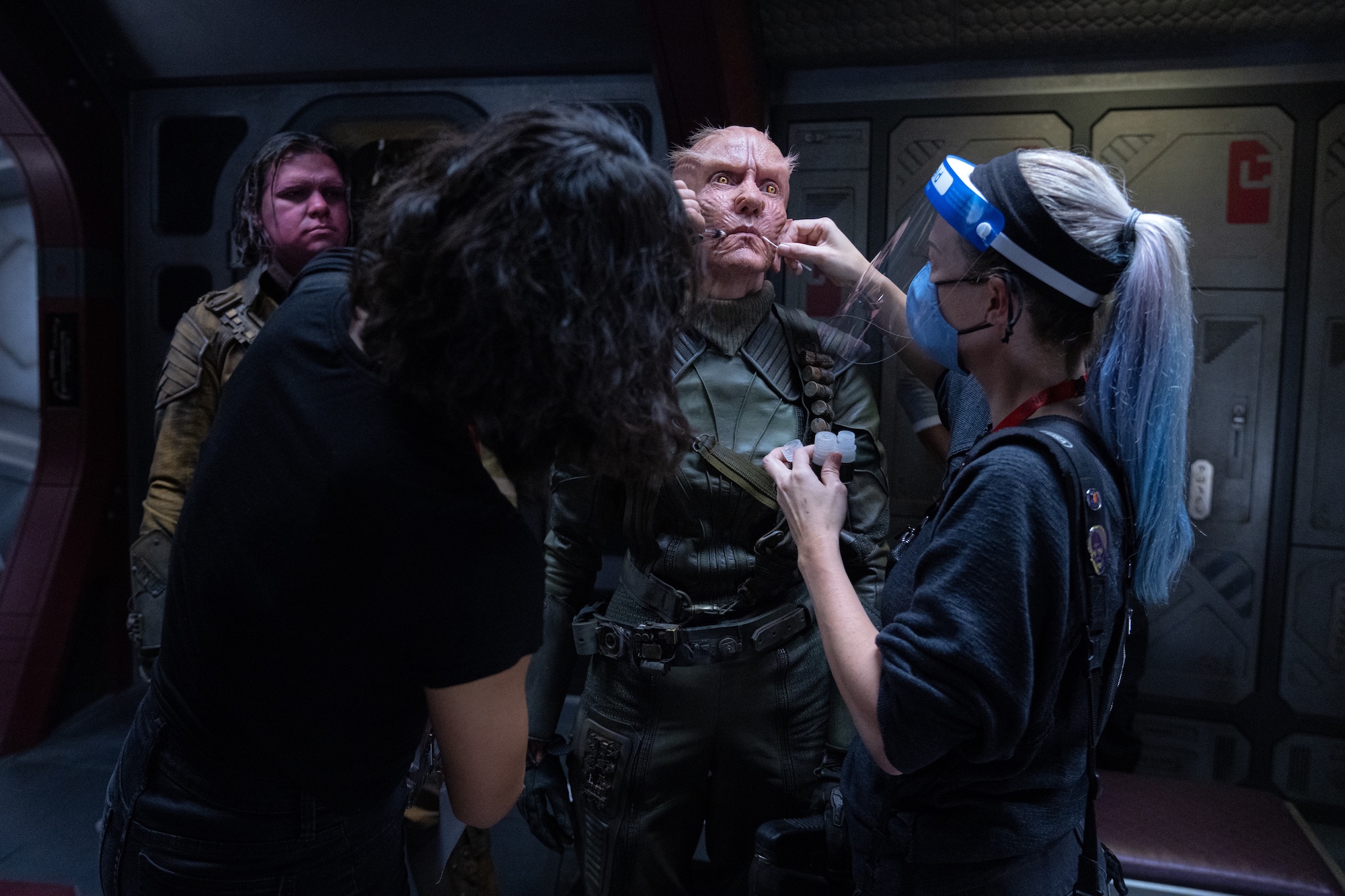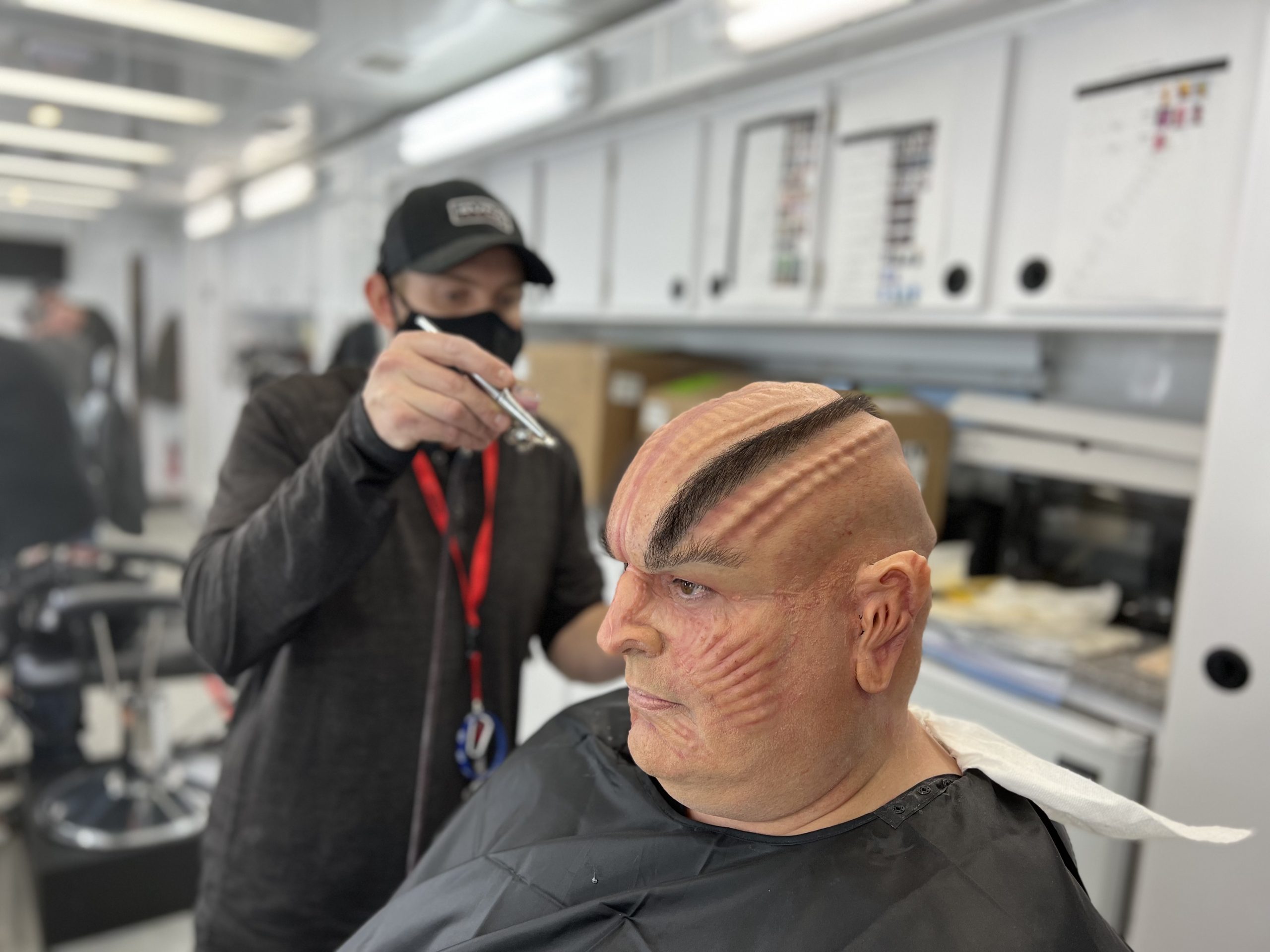 Cassie Russek: Yes! Ura is a Krylorian played by Daniela Melchior. Costume designer Judianna Macovsky had a very clear vision of Orgocorp as a very 60s nuance type planet. Every character was very sleek, clean, and wore some type of Vidal Sassoon bob, including Ura. Her wig was built into two pieces. The top piece with the bang had a center part that we used to showcase her skin color into her scalp by custom dying a pink wig cap and having the makeup team paint the opposite end to make it pop underneath! The bottom piece was attached so that it could fully move with her neck to prevent it from looking “wiggy”. She is one of my favorite characters. We played a lot with different glue techniques based on what types of paint and makeup were used that day – we’d occasionally have them paint our hands and would take extra lace and glue to make sure we weren’t pulling paint and making it messy. It turned out PERFECT every time. Each alien race had a different type of glue depending on the paint and prosthetics. You’ll never see any lace showing on this film!