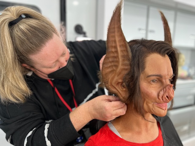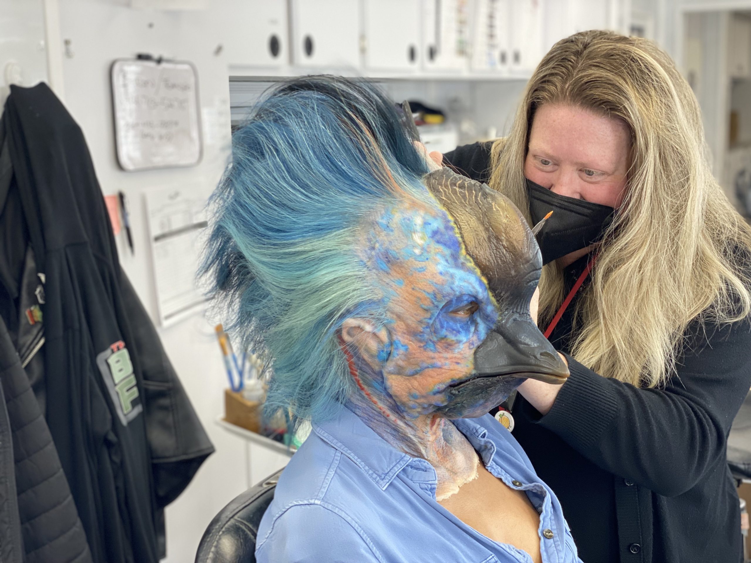 Alexei Dmitriew: Legacy Effects did the designs for the film. My job as the Department head was to work with them to figure out the makeup process and lead the team to execute it on set. I think the most challenging makeups were the Humanimals. James and Legacy did an amazing job creating a really unique look for them; they were all thought out so well and had many unique characteristics. All of their makeup was engineered with the goal of ensuring comfortability for the actors throughout filming and making sure the makeup process went smooth – especially because we had so many of them to do every single day. Scott Stoddard and I did the Bat Mom’s makeup; the actress, Darla Delgado, wore a 9-piece prosthetic makeup that consisted of front and back of head, forehead, ears, chin, arm fins, and skull cap. The look was finished off with custom teeth, contact lenses, nails, and an amazing wig made by Legacy effects and styled and applied by Hair Department Head Cassie Russek. It took Scott about an hour and 45 minutes to apply and paint.