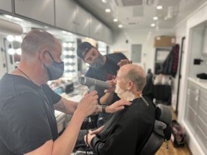 Cassie Russek: We had a team of 11 full-time hairdressers, including our personal hairdressers. On our biggest days, we would have upwards of around 60 hairdressers. Our background supervisor, Raissa Patton, did an incredible job keeping track of the sheer mass of work that went into this film. On top of the nearly 500 wigs we used, we were also doing hairstyling work on anyone’s hair we could use! I commend my team of over 80 hairdressers because we all worked incredibly hard to make it happen!