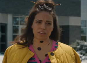 “It’s kind of a sweater vest with a cowl neck,” Pearce says of an outfit worn by Ambrosia in a scene between her and Carl. “That was a poncho that I thrifted, and I transformed it a little with some knitting on the side. What I wanted to do with Ambrosia is show how her clothes were another creative outlet for her. In my mind, I came up with this backstory that she grew up crafting, and she has these women in her life–like her grandmother and her mother–who did it with her in a craft room in her house. To her, when you see that she paints a UFO with blood in the first episode, nothing is sacred to her. I wanted to see her using heirloom antiques and blankets and things that were knit and crocheted to put them into her look. She would put spins on things that would seem nontraditional. There’s a cream jumpsuit that she wears with a lime green turtleneck that has these sides that were made of an antique blanket. Those pieces were so beautiful, because someone made those with their hands and we reworked it. It didn’t have to be crazy, but I wanted everything to look like Ambrosia did it herself. I was part of the design team on Saturday Night Live, and I learned how to make incorporate the costumes into the joke. It’s part of the punchline, and that’s so exciting to me. Ambrosia’s looks are total sleepers, and it proves that she’s kooky as hell.”