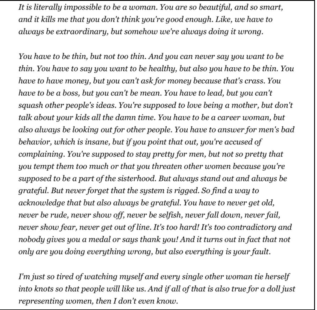 3. Gloria (America Ferrera’s character) wants there to be a Barbie for just an ordinary mom, not extraordinary, who is married with a daughter. If they wanted to be “man-hating,” Fererra would complain about her husband but she doesn’t. She seems happy in her life – good job, good marriage, with her only problem being a bratty daughter.