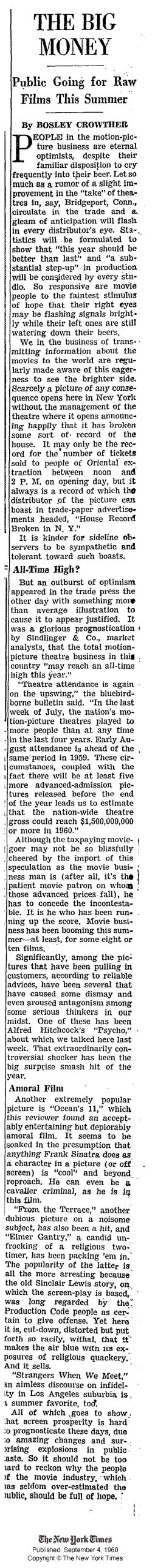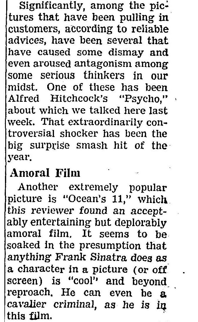 Back in 1960, movies themselves were being threatened by the first Golden Age of live television. Technology had changed and so too had patterns of American cultural consumption. Bosley Crowther wrote in the New York Times back in 1960 about how movies had experienced a sudden jolt of creative energy, much like we just had with Barbenheimer and Sound of Freedom surprising everyone at how well they are doing. Only in 1960, it was the stunning one-two punch of Psycho and Oceans 11 — which Crowther flat-out called “amoral.”
