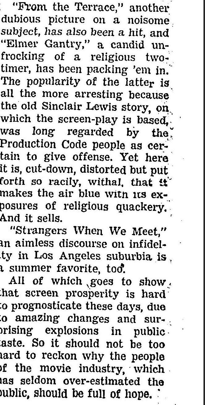 What can we learn from what Crowther was saying 63 years ago, and how does it align with the kinds of movies are doing well now. It’s mostly the same, right? Because at the moment, we’re in the midst of another pendulum shift, just as they were in 1960.
