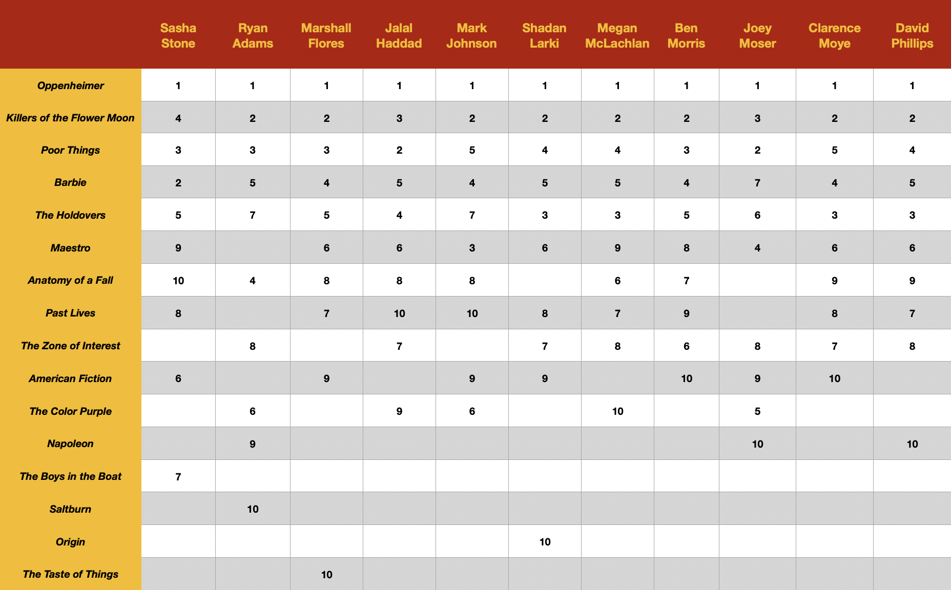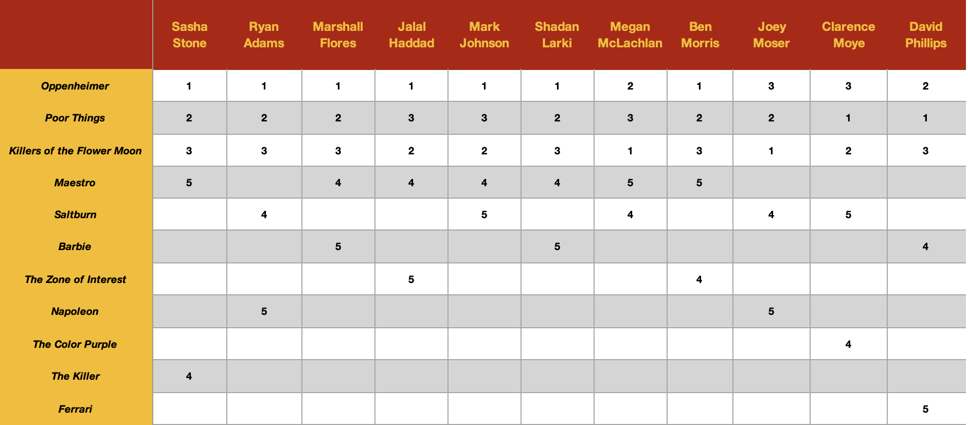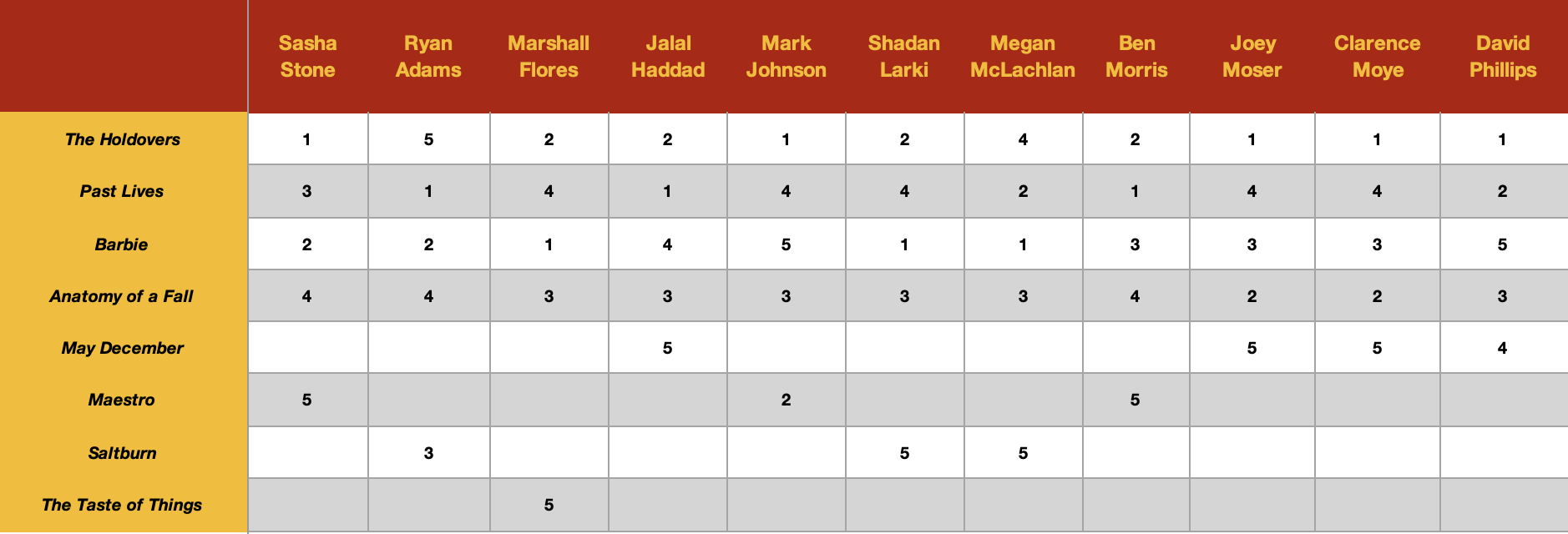 We’re still in the midst of the festival season, and not all Squad members have seen everything. Many of these predictions stem from online chatter, early reviews, and box office domination (obviously in the cases of Oppenheimer and Barbie). It’s always fun to see how the charts shift as the season progresses, particularly once we head into December’s critics and guild window.