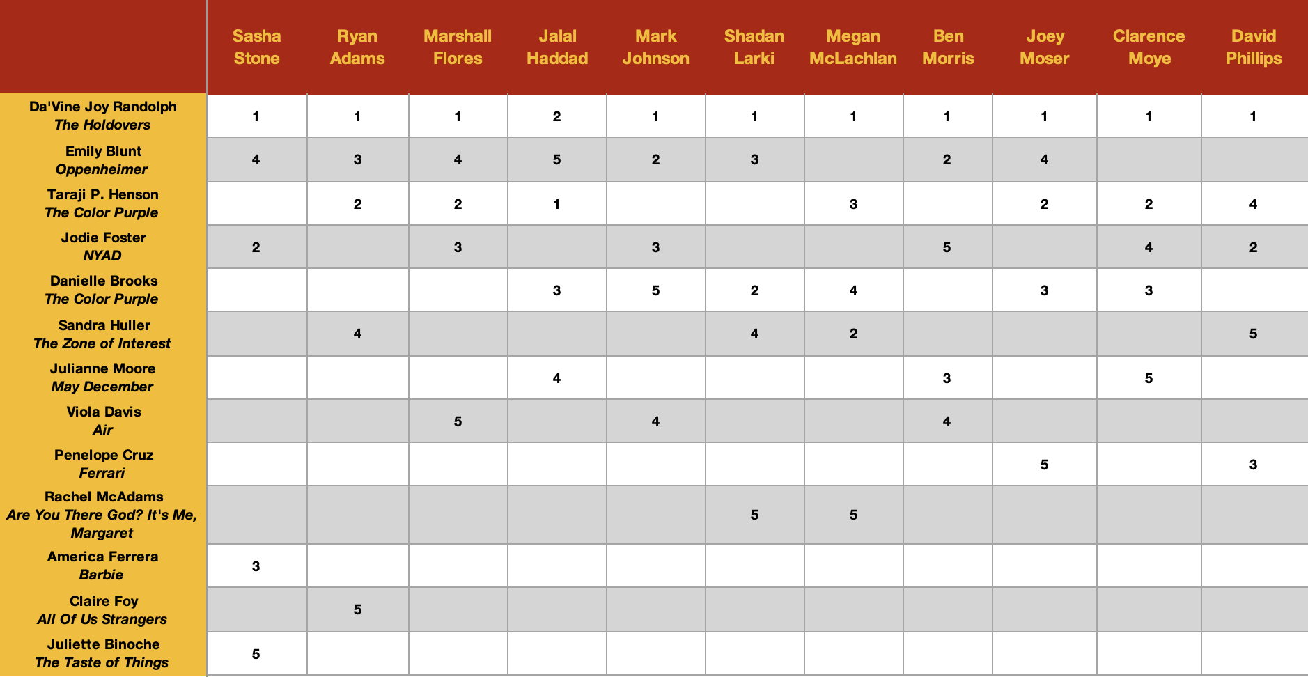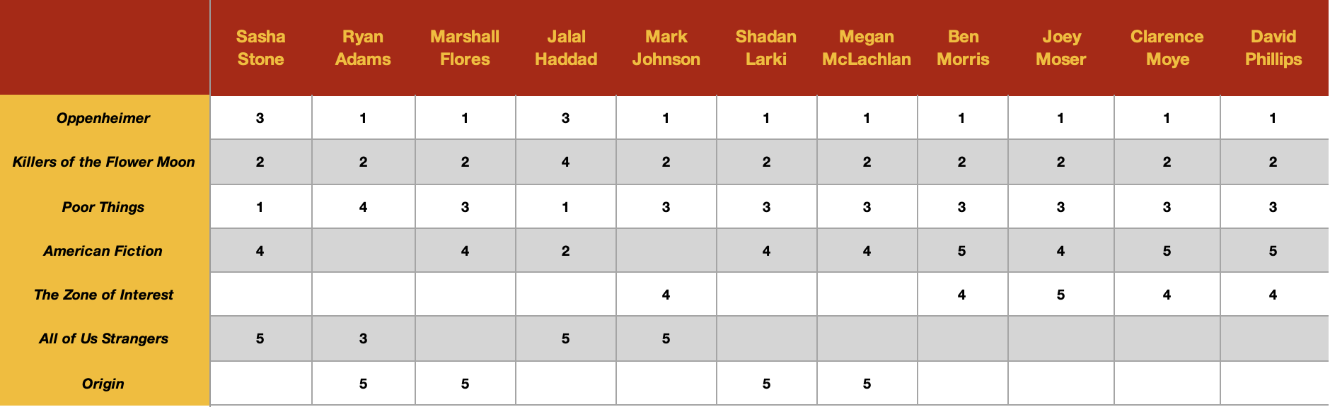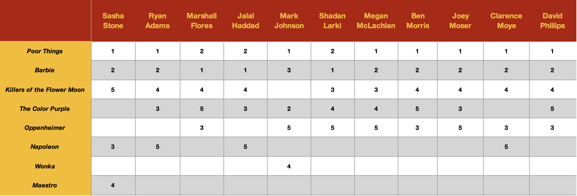 We’re still in the midst of the festival season, and not all Squad members have seen everything. Many of these predictions stem from online chatter, early reviews, and box office domination (obviously in the cases of Oppenheimer and Barbie). It’s always fun to see how the charts shift as the season progresses, particularly once we head into December’s critics and guild window.