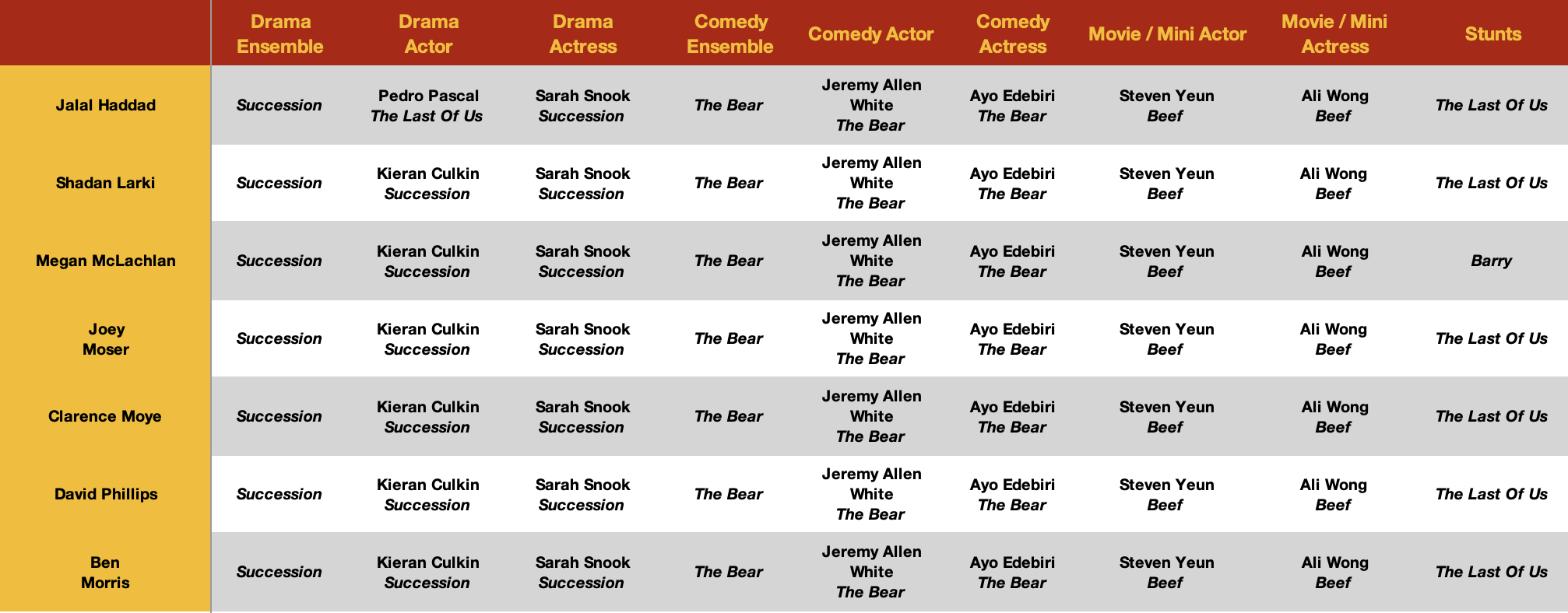 Granted, the excitement this year lives within the film awards, which we covered on this week’s All This and the Oscars Too podcast. But the TV awards could at least try to offer up something unique, something different. Instead, they will likely rubber stamp the recent winners at the 2024 Golden Globes and the 2023 Emmy Awards. That means HBO’s Succession, FX’s The Bear, and Netflix’s Beef will take home all of the major trophies. That’s certainly what the overwhelming majority of Team ADTV is predicting anyway. The lone holdout is Jalal Haddad predicting a potential Pedro Pascal (The Last of Us) win for Actor in a Drama Series.