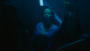 Bea is part of a small commune, but Nkemi intentionally keeps things intentionally vague as we see them all dressed in white and picking at their bruised arms. The sound of the bouncing, scratched skin is enough to put you on edge. It appears that Bea is given a mission as an elder gives her a bag containing a sparkly green and purple coat before she enters a nightclub.