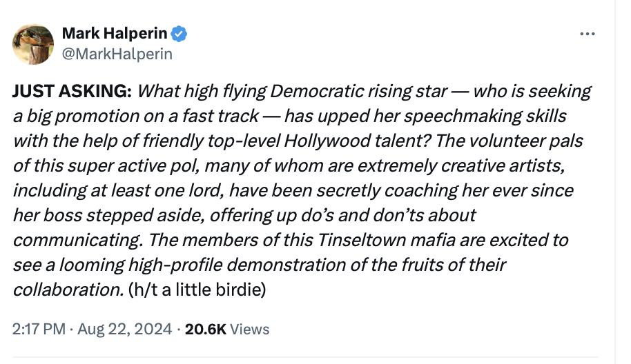 So it’s very likely this is Kamala Harris, right? But who would be the Tinseltown mafia involved here? I did notice she seemed to have been coached in between the coup against Joe Biden and her first public speeches. To quote my mother, “she doesn’t sound as nasally and she doesn’t cackle as much so now I have no problem with her.” I noticed a softer version of Harris compared to her firebrand speeches from 2019. Her pivot from “threat to democracy” to “joy” seemed also to be pre-planned and orchestrated. Whatever they did, it seems to have worked. People see her differently than they used to and is leading in the polls. Good old Hollywood. So what do you make of it? I find it a fascinating story, albeit one the media will very likely never tell.