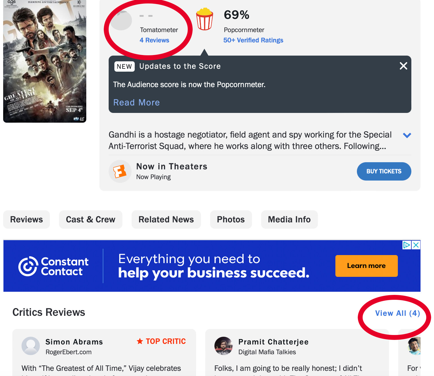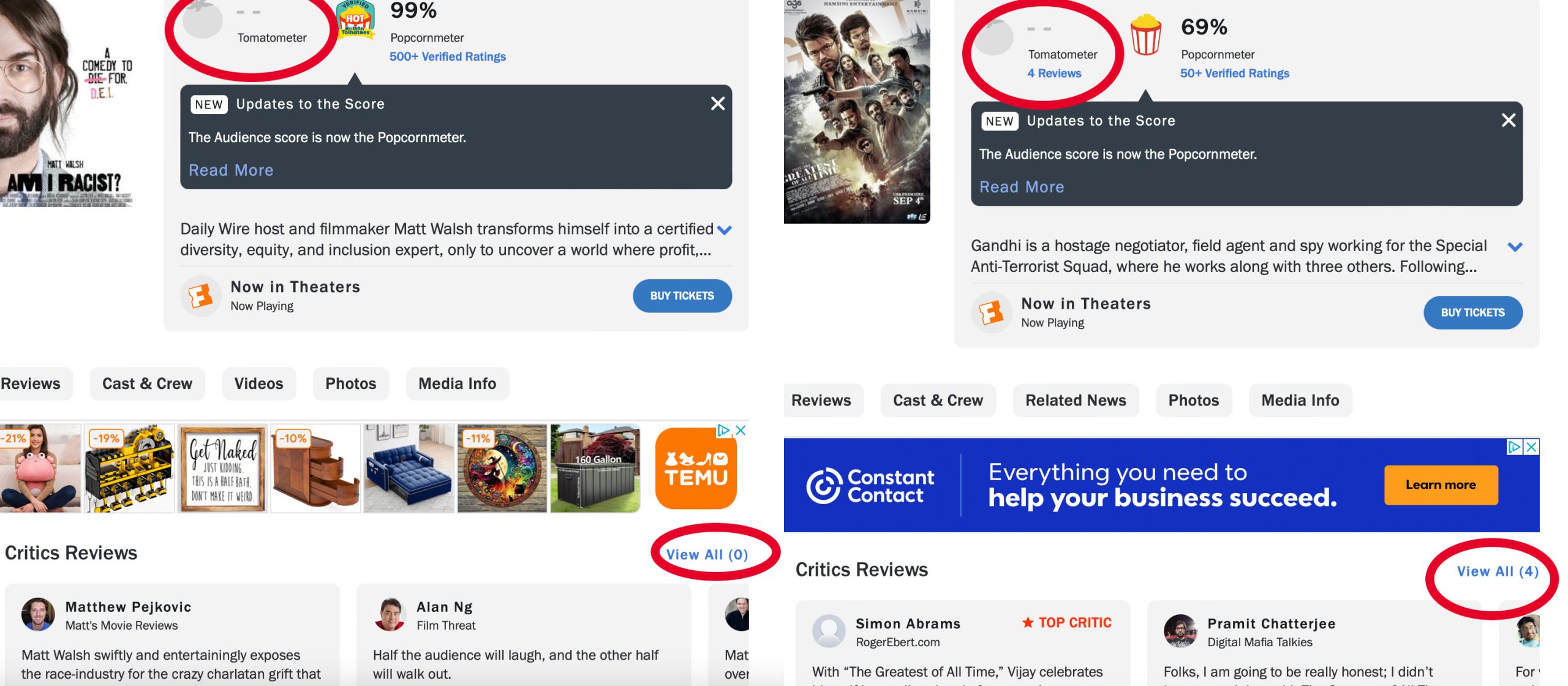 I scrolled through the site to see if any other movies had no numbered score and one did. It’s called The Greatest of All Times, GOAT. It has four reviews. But when you click on it, it shows that number where Am I Racist does not: