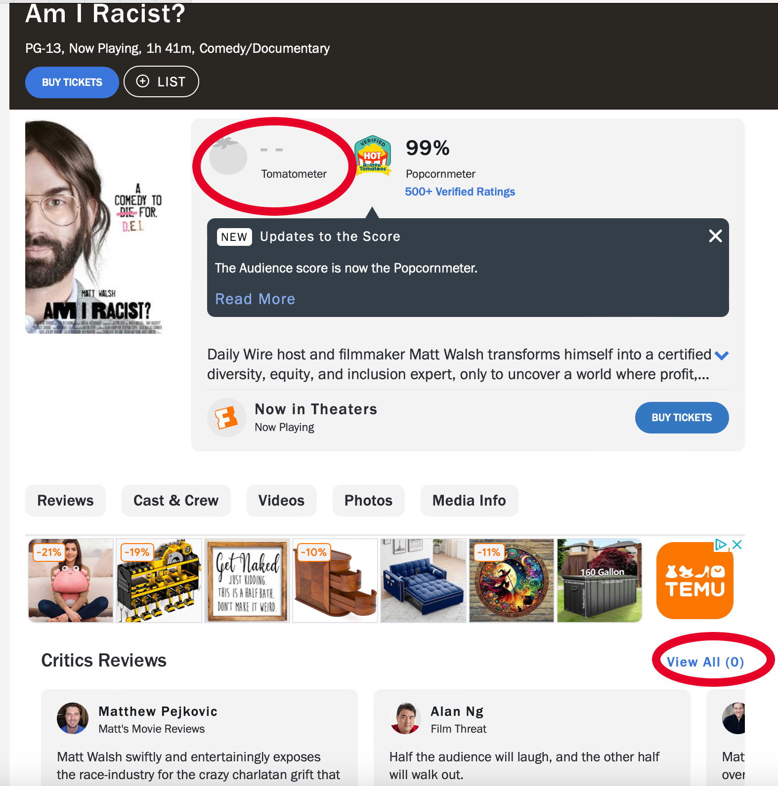 I thought it was strange to visit Rotten Tomatoes to find out what the score was for The Daily Wire’s Am I Racist. The main page looks like this – you’ll note no score for the movie and reviews listed as “zero.”