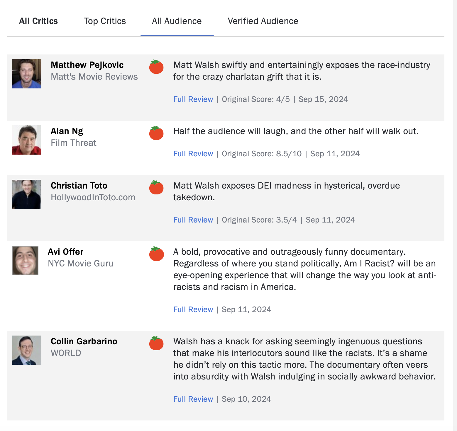 So what gives? Am I racist came in at number four on the box office chart, which isn’t bad. Its per-theater average puts it at number three. Obviously, it did well despite a complete and total blackout by the mainstream press, and despite that none of the so-called “top critics” (whatever that means) deigned to review it. Only a small handful did. But that’s only in print.