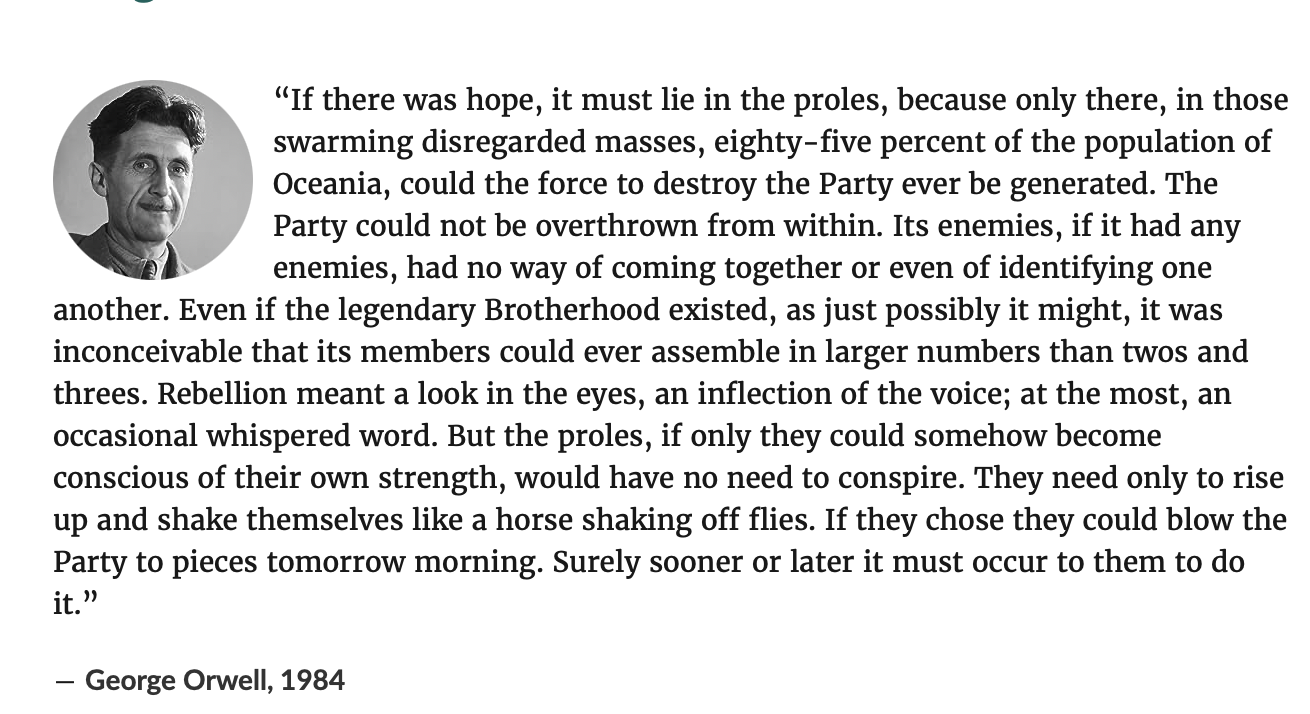 It was easier for me to see because I was no longer on the “inside” but was on the “outside” and thus, I could see reality. AND, I have read and love 1984 and everything that has happened is in that book: They built an “inside,” which was a utopia — a ruling minority of elites. That bothered Orwell because he was Communist but not a Stalinist. So he wrote the greatest book of all time, in my opinion, but I would not have believed that if we hadn’t just lived through it.