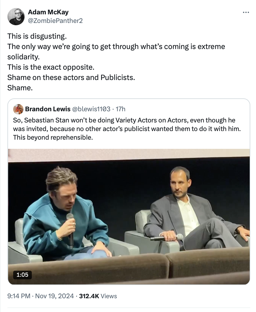 There seems to be a bit of a controversy-not-controversy brewing online. Sebastian Stan has said that he wanted to do a Variety’s Actors on Acting but none of the publicists wanted their clients associated with him so he could not do it. I hate to break it to Mr. McKay but welcome to the new normal. This is the monster you and everyone else have created where it’s perfectly fine to shun people, unperson them and obliterate them out of fear of blowback or pushback or being associated with someone who is deemed “toxic.”