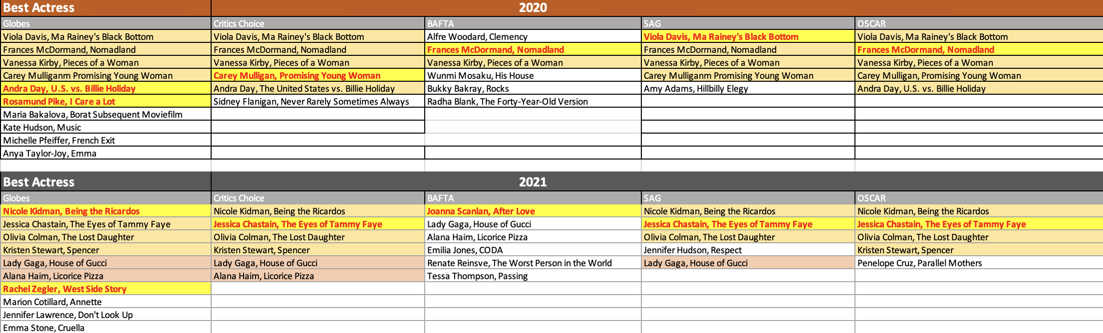 But if you did go by precedent and the Golden Globes, finding an Oscar winner that didn’t win at least one or the other category at the Globes is nearly impossible. It did happen in 2020 when Frances McDormand came out of nowhere and won the BAFTA and then the Oscar, and the following year, Jessica Chastain didn’t win at the Globes or BAFTA and still won the Oscar: