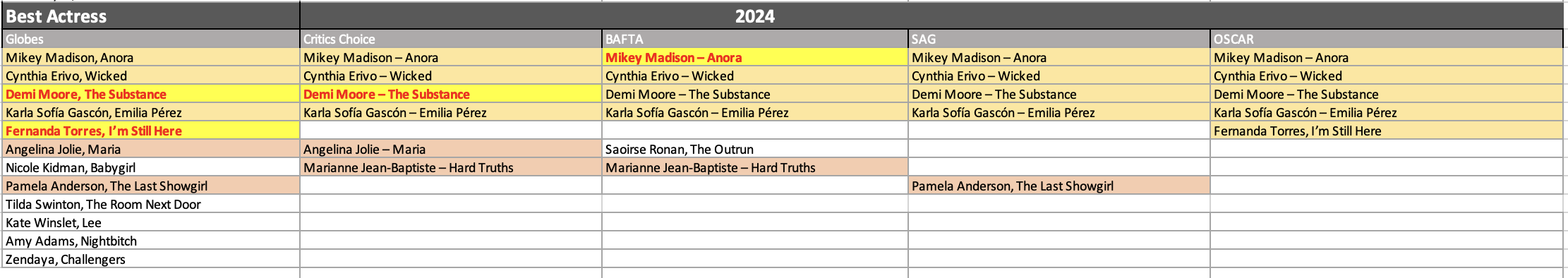 A few days ago, Kris Tapley made the point on Twitter that Mikey Madison is the whole movie so why would they award the movie and not her? That’s a great question. They would only do so because they wanted to award Demi Moore because it makes them feel better doing so.