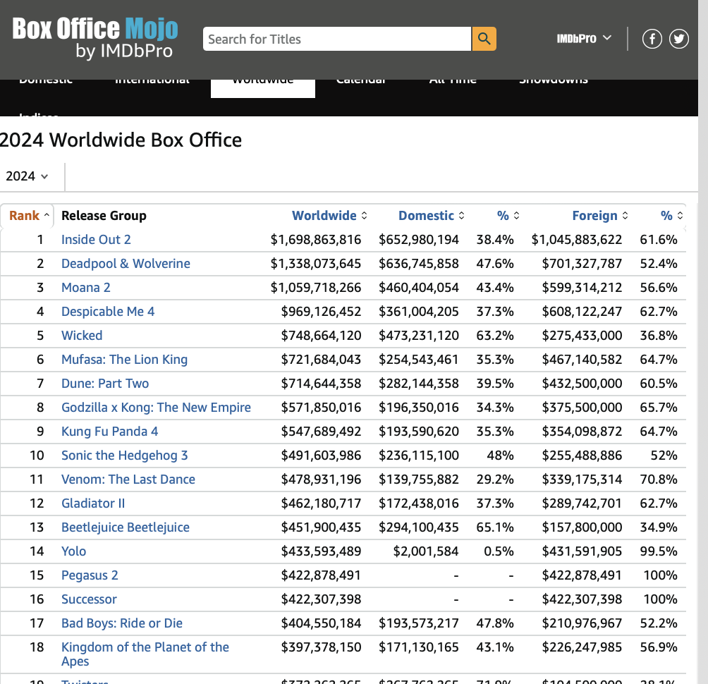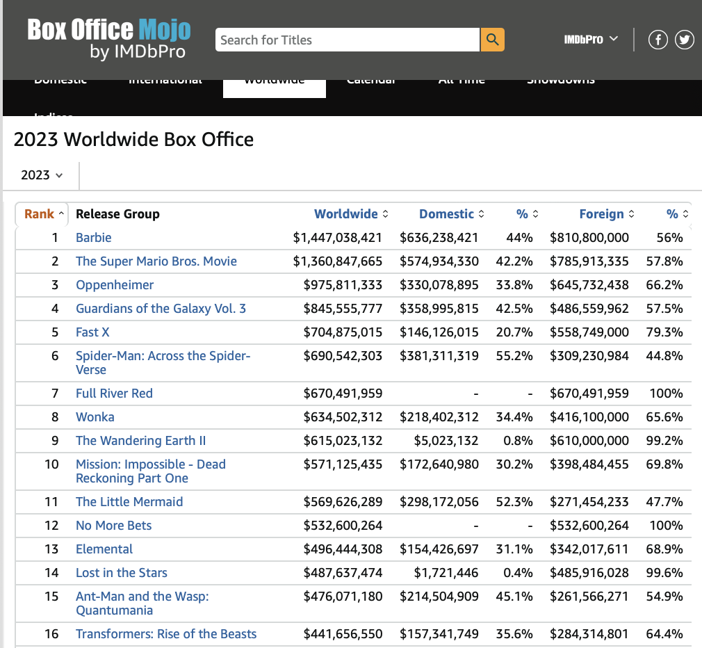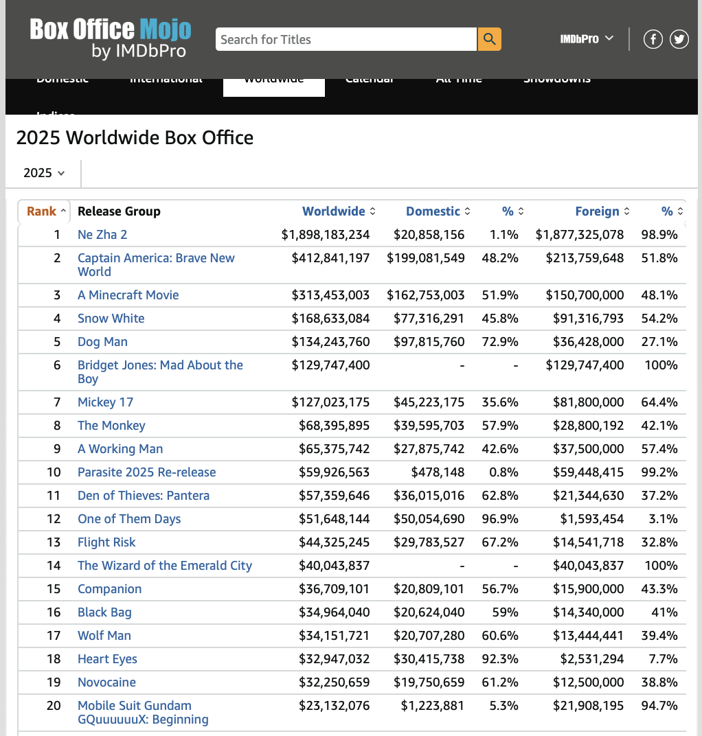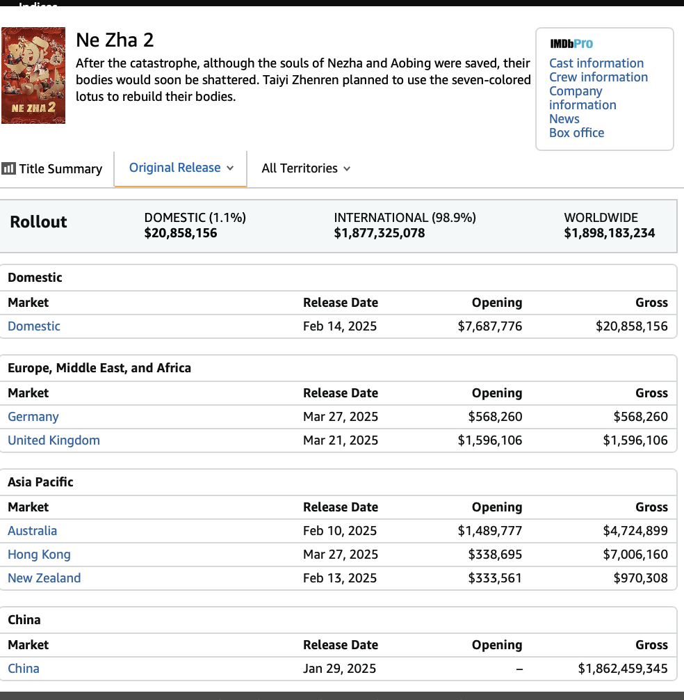 After COVID, the Chinese box office collapsed, just as ours did here. It is coming back. Most outlets weren’t covering what was happening because 1) it is verboten to talk about the collapse of Hollywood’s box office and 2) it is verboten to say, “Hey, look at China!”. But here you go. The number one movie worldwide as of right now?