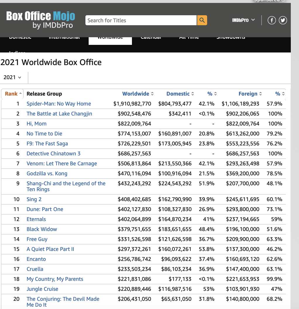 Here, the Battle at Lake Changjin, Detective Chinatown 3, Shang-Chi and the Legend of the Ten Rings. Correction: Not a Chinese movie. A pandering to China movie from Marvel.