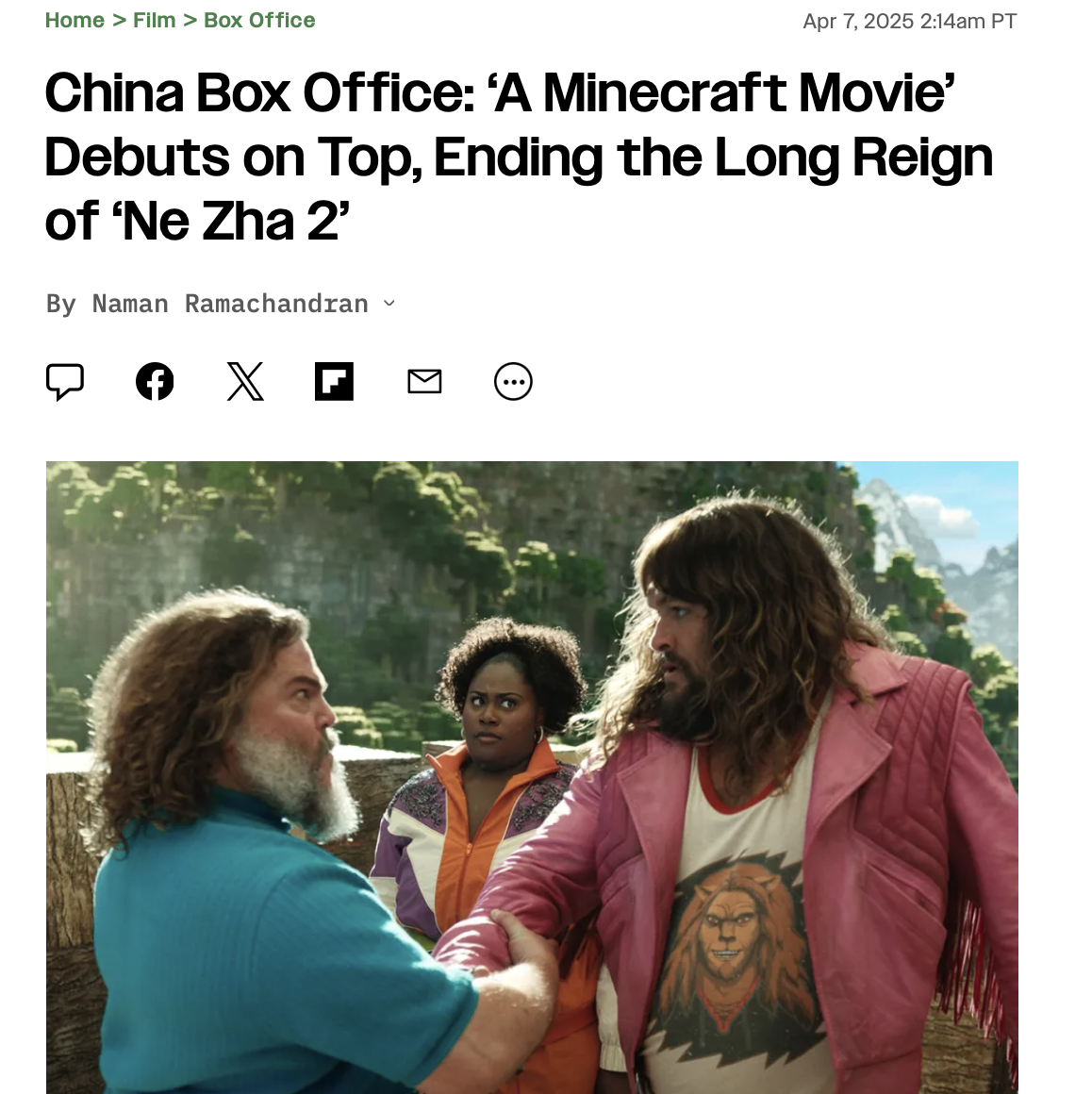 No way around it, the US has to make better movies. Minecraft might be a terrible movie — by all accounts it is. No one in Hollywood likes making movies like that (like the Kool-aid movie in The Studio). But so far, the business seems determined not to hire great writers and directors but instead to keep re-arranging the deck chairs on the Titanic. This is a perfect time for China to pull ahead. Why wouldn’t they.