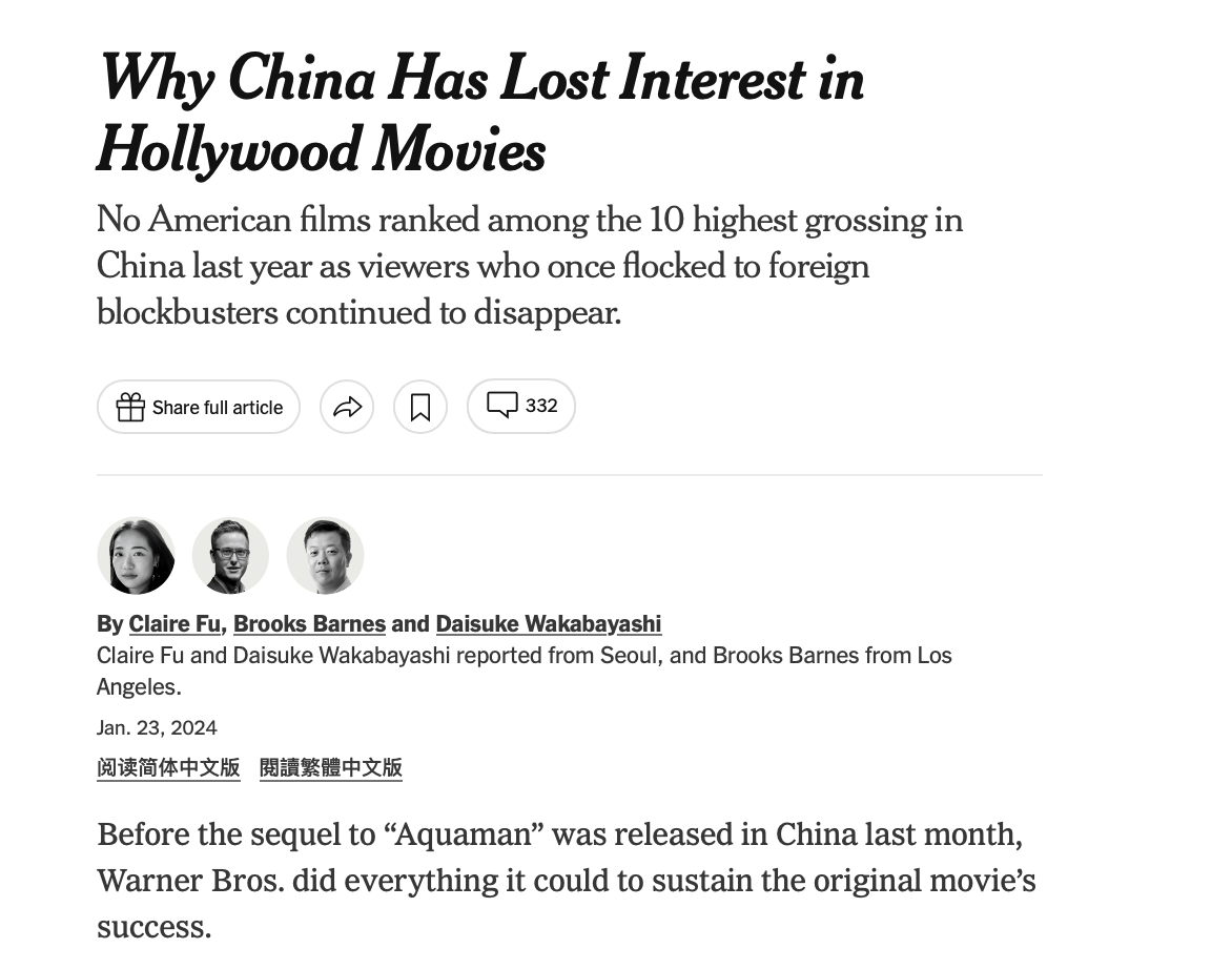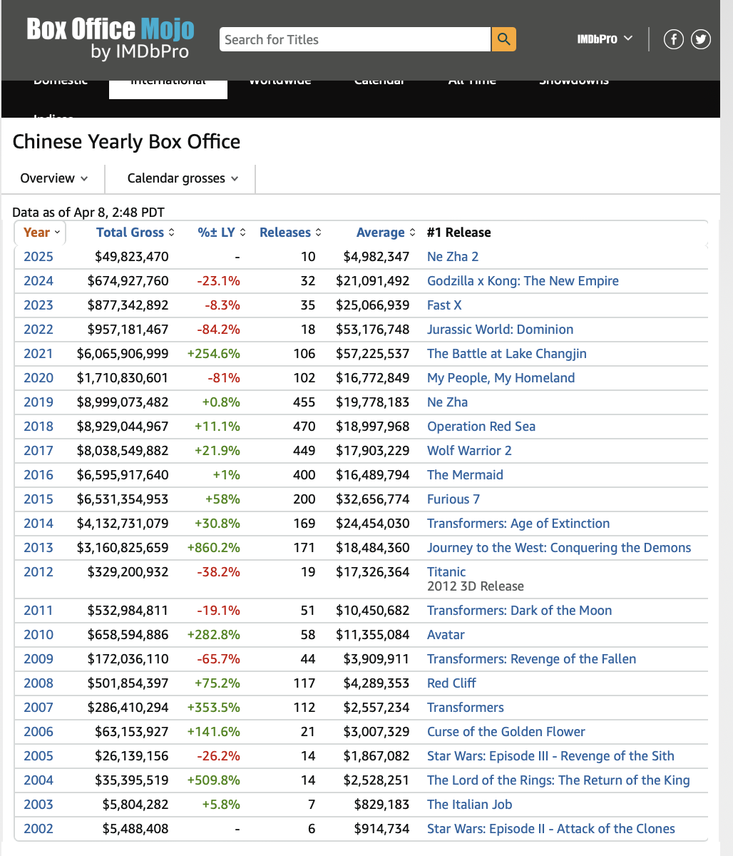Ironically, most of film coverage now is as much propaganda for one political party as one might find in China. Deadline is doing its part to convey the message that Trump’s tariffs are hurting the American film business because now China will ban US films from playing in their lucrative market. The truth is that China has been pushing out American films, especially as they have become more “message-driven” (just like China!) but also because they’re building up their own profitable industry. Here is a story from the New York Times from last year: