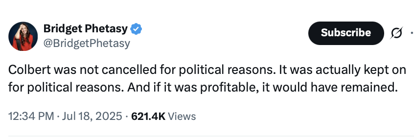 Instead, they’re falling back to their happy/miserable place, realizing that this was not a decision made by a corporation to survive the coming storm, but rather an act of authoritarianism. But that is not true. If it were, CBS News would have axed 60 Minutes, not the Colbert Show. There is no need for late-night anymore. It’s managed decline for an audience that hasn’t yet adapted to new media.