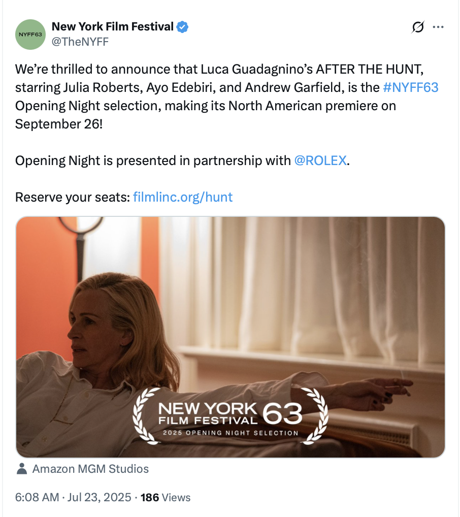 The New York Film Festival has given Luca Guadagnino’s After the Hunt the opening night slot: