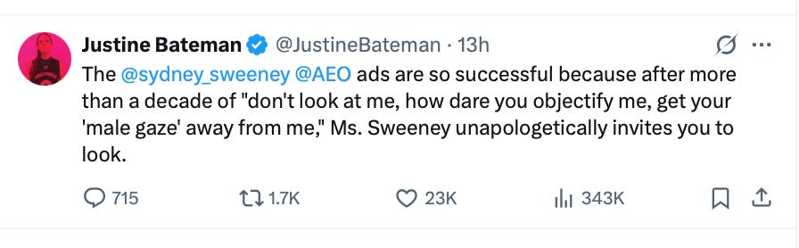 The pendulum is swinging away from the monoculture of the Left, and nothing makes that more evident than the ads featuring Sweeney for American Eagle. As Justine Bateman accurately states: